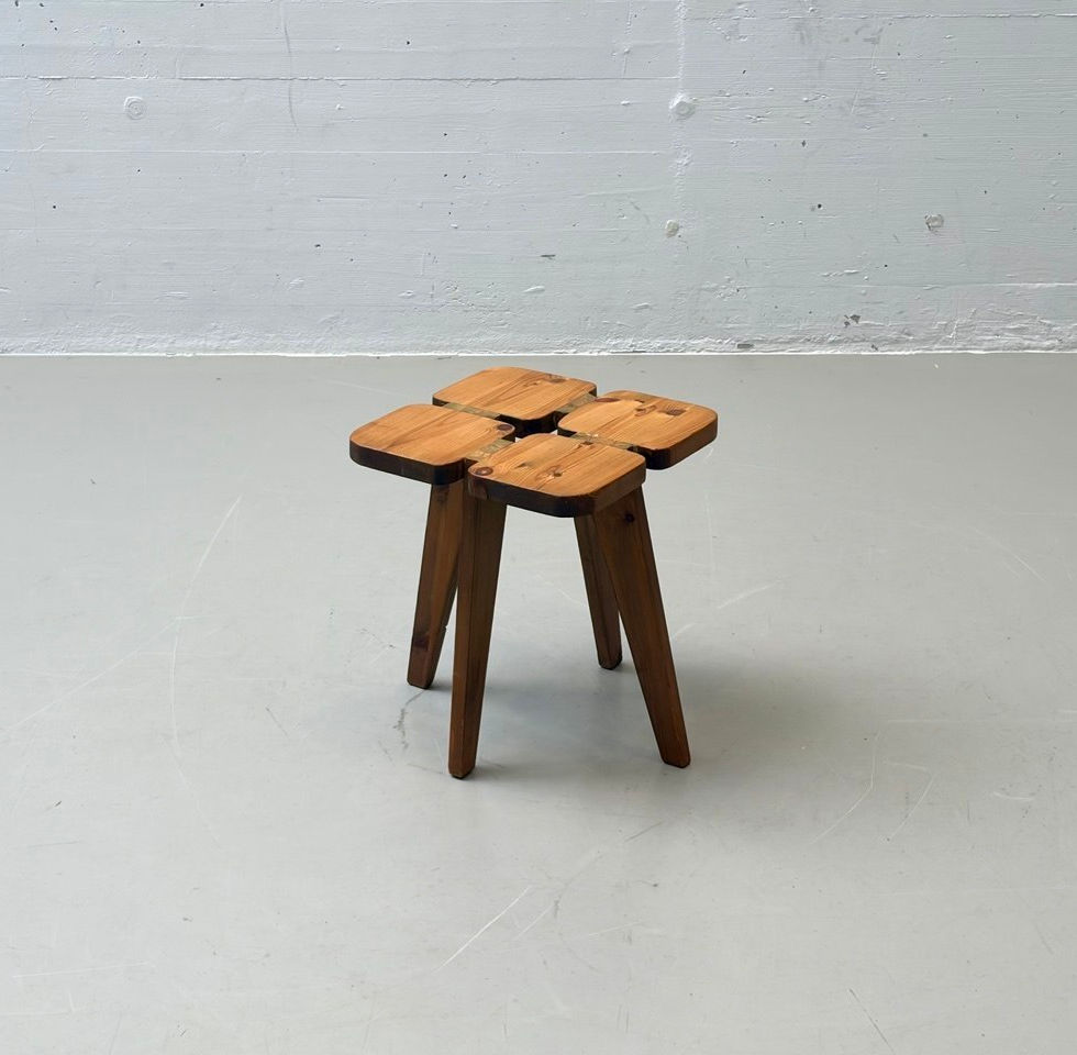 Skulpturaler Hocker mit organischer Anmutung, entworfen von Olof Ottelin und Rauni Peippo Apila für das finnische Warenhaus Stockmann. Die Sitzfläche setzt sich aus vier abgerundeten Massivholzsegmenten zusammen, die in ihrer Anordnung an ein Kleeblatt erinnern und dem Modell seinen Namen geben. Das klar konstruierte Gestell greift diese Formsprache auf und verleiht dem Hocker eine markante, nahezu architektonische Wirkung. Gefertigt aus massivem Kiefernholz mit sichtbarer Maserung, steht der Entwurf exemplarisch für die finnische Designhaltung der 1960er Jahre, bei der Funktionalität, Materialehrlichkeit und eine naturnahe Formgebung im Vordergrund stehen. Der Hocker eignet sich sowohl als Sitzgelegenheit wie auch als Beistell- oder Solitärobjekt und lässt sich platzsparend verstauen.