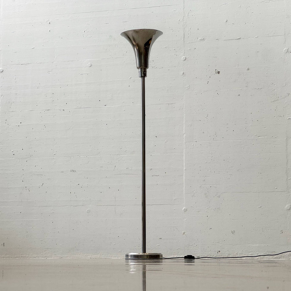 Elegante Art Deco Stehleuchte mit klassischer, zeitloser Linienführung und charakteristischem Trompetenschirm. Die Leuchte besticht durch ihren konisch geöffneten Schirm, der das Licht weich nach oben abstrahlt und eine angenehme, indirekte Raumwirkung erzeugt. Gefertigt aus verchromtem bzw. vernickeltem Metall, zeigt sich die typische Materialwahl der Art Deco Epoche: kühl, technisch und zugleich luxuriös. Der schlanke, durchgehende Schaft mündet in einen massiv ausgeführten Rundfuss mit feinen, konzentrischen Zierlinien – ein schönes Detail, das die hochwertige Verarbeitung unterstreicht. Der integrierte Kippschalter am oberen Schaft sorgt für eine funktionale und zugleich stilistisch passende Bedienung. In Kombination mit der klaren Geometrie entsteht eine ruhige, architektonische Präsenz, die sowohl in klassischen als auch modernen Interieurs hervorragend funktioniert.