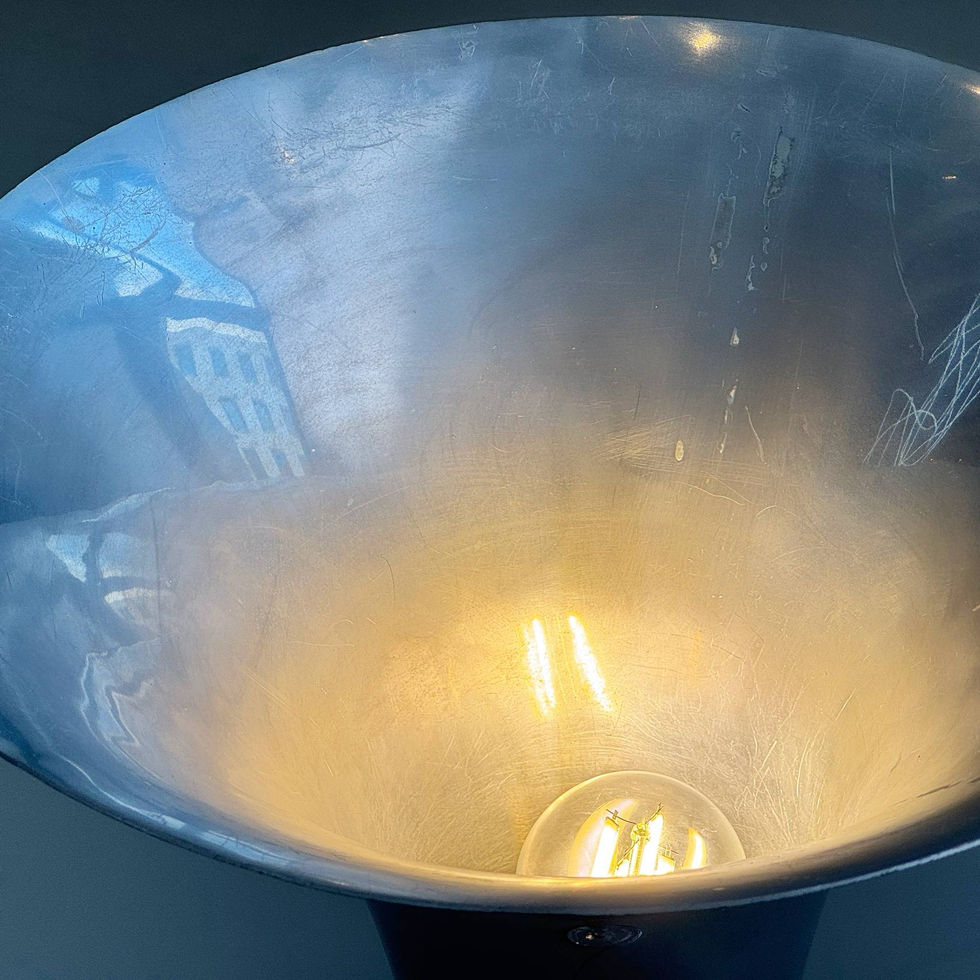 Zustand: Guter Vintagezustand mit altersbedingter Patina. Leichte Kratzer und Gebrauchsspuren am Metall, insbesondere am Fuss. Schirm mit feinen Gebrauchsspuren. Technisch funktionstüchtig.
