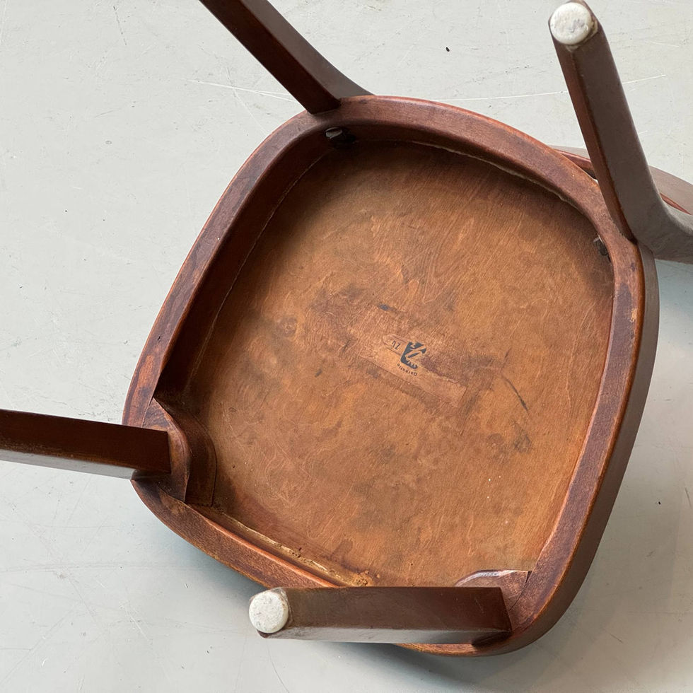 Klassische Beizenstühle aus gebeiztem Massivholz mit kompakter, funktionaler Formensprache. Die leicht trapezförmige Sitzfläche mit weich gerundeter Vorderkante ruht auf konisch zulaufenden Beinen, die über eine sauber ausgearbeitete Zarge verbunden sind. Die geschwungene, massive Rückenlehne ist seitlich in die Hinterbeine eingelassen und verleiht dem Stuhl trotz schlichter Konstruktion eine angenehme optische Spannung. Auf der Unterseite befindet sich das originale Herstelleretikett Möbelfabrik Zürich (mit stilisiertem Logo und dem Hinweis Garantie sowie Anno 1956). Dies weist klar auf eine Schweizer Produktion hin und datiert die Stühle in die 1950er Jahre. Die Machart, die solide Verschraubung sowie die typische Ausführung sprechen für robuste Gastronomie- oder Beizenmöbel dieser Zeit.