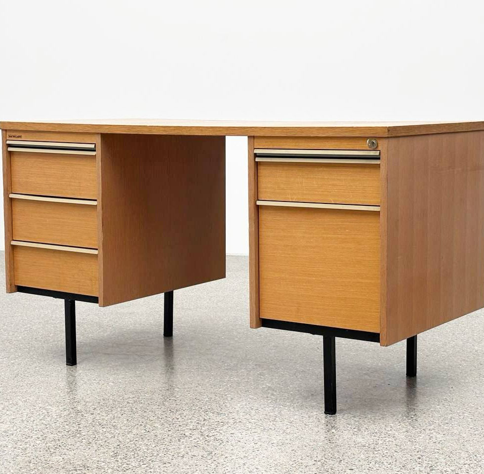 Er verfügt über eine grosszügige Arbeitsfläche mit einem soliden Holzfurnier-Finish. Die beidseitigen Schubladencontainer bieten viel Stauraum: auf der linken Seite befinden sich drei Schubladen, während die rechte Seite über eine kleine Schublade sowie ein grosses, für Hängeregister geeignetes Fach verfügt.
