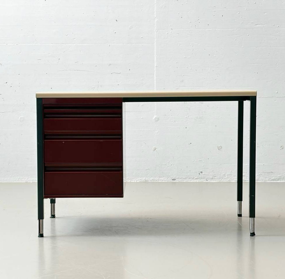 Kompakter Schweizer Designklassiker aus dem Hause Bigla, geprägt von funktionaler Klarheit und industrieller Eleganz. Der Schreibtisch kombiniert ein filigranes Stahlrohrgestell mit einem farblich abgesetzten Metallkorpus und zeigt damit die typische Formensprache des Mid-Century Office Designs. Die Tischplatte aus Resopal in hellem Beige bildet einen ruhigen Kontrast zum dunkel lackierten Gestell sowie zum bordeauxroten Korpus. Diese reduzierte Farbkomposition verleiht dem Objekt eine grafische Wirkung. Seitlich integriert befindet sich ein dreiteiliger Schubladenblock aus Metall mit originalen Einsätzen und praktischer Innenaufteilung. Die leichtgängigen Auszüge und die robuste Konstruktion unterstreichen die hohe Qualität der Schweizer Serienfertigung. Bigla steht seit über 100 Jahren für funktionale und langlebige Büromöbel Swiss made. Die schlanken Metallfüsse mit verchromten Abschlüssen sorgen für Leichtigkeit und geben dem Möbel trotz seiner Funktionalität eine elegante Präsenz im Raum.