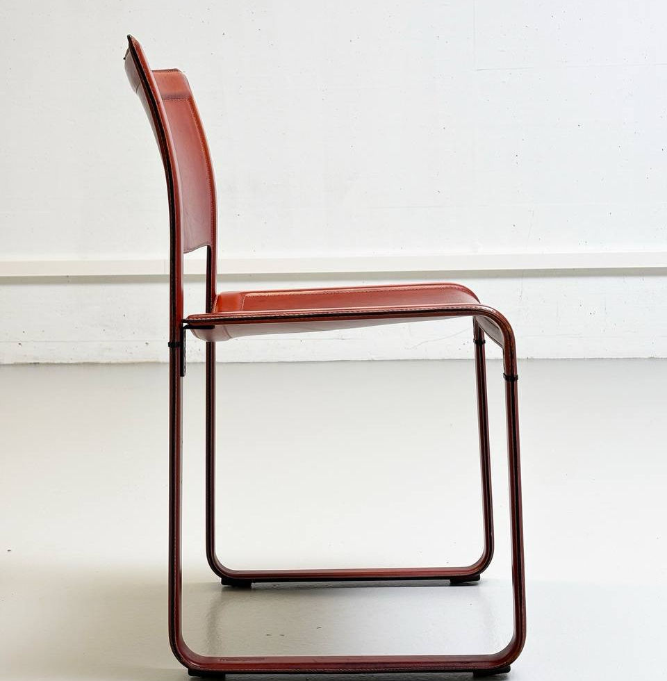 Diese aussergewöhnlichen Stühle wurden in den 1980er Jahren von Tito Agnoli für Matteo Grassi entworfen. Der Stuhl hat einen Stahlrahmen welcher ringsum mit dem Cognac Leder versehen ist.