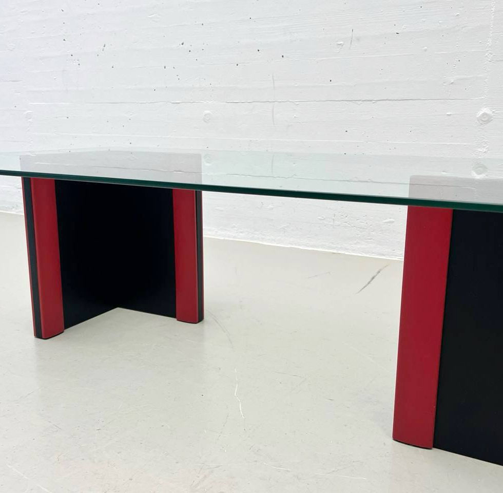 Die Beine sind in einem tiefen Schwarz gehalten und seitlich mit roten Akzenten versehen, wodurch ein spannungsvolles grafisches Spiel entsteht. Die Kombination von klarem Glas und farblich kontrastierendem Untergestell verleiht dem Möbelstück einen expressiven Charakter, der an die Gestaltungsideale italienischer Designer der 1980er-Jahre erinnert.