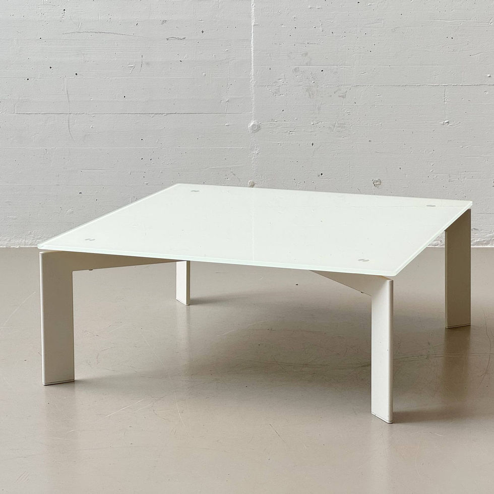 Minimalistisch gestalteter Couchtisch mit quadratischer, weiss satinierter Glasplatte und klarer geometrischer Formsprache. Die Platte liegt auf einem stabilen, weiss lackierten Stahlgestell mit geradlinigen Beinen und einer zurückhaltenden Querstrebe zur zusätzlichen Stabilisierung. Dezente Metallpunkte zur Fixierung der Glasplatte setzen einen feinen technischen Akzent und unterstreichen den puristischen Charakter des Entwurfs. Durch das reduzierte Design fügt sich der Tisch harmonisch in moderne wie auch zeitlos eingerichtete Wohnräume ein.
