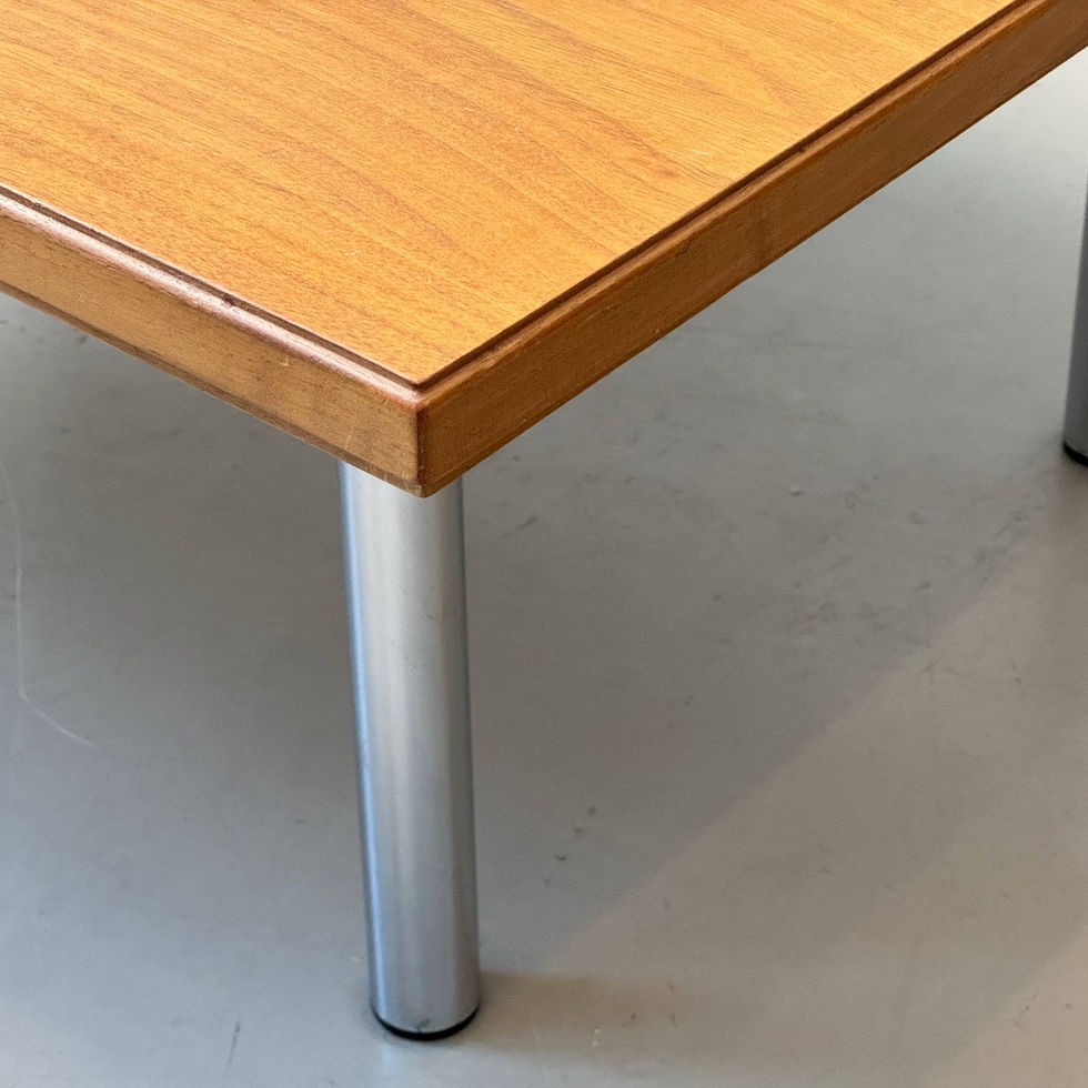 Schlichter Couchtisch im funktionalen Mid-Century Design mit klarer, architektonischer Linienführung. Die rechteckige Tischplatte besteht aus hochwertigem Nussbaumfurnier, dessen lebendige Maserung dem Möbel eine warme und elegante Ausstrahlung verleiht. Die umlaufende Kante ist fein abgeschrägt und betont die leichte, hochwertige Anmutung der Platte. Getragen wird die Konstruktion von vier zylindrischen, verchromten Metallbeinen, die direkt unter der Platte montiert sind. Der Kontrast zwischen dem warmen Holzton und dem kühlen Chrom ist typisch für Möbel der späten 1960er bis 1970er Jahre. Die Proportionen machen den Tisch vielseitig einsetzbar – als Couchtisch, Beistelltisch oder auch niedriger Loungetisch.