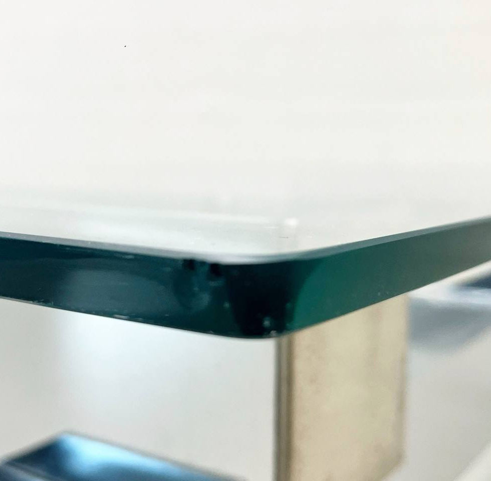 Der Tisch besteht aus einer schweren, klaren Glasplatte, die auf einer geometrisch aufgebauten Basis aus verchromtem Stahl ruht. Die Konstruktion wird von massiven, kubischen Verbindungselementen gegliedert, die dem Entwurf einen architektonischen Charakter verleihen.