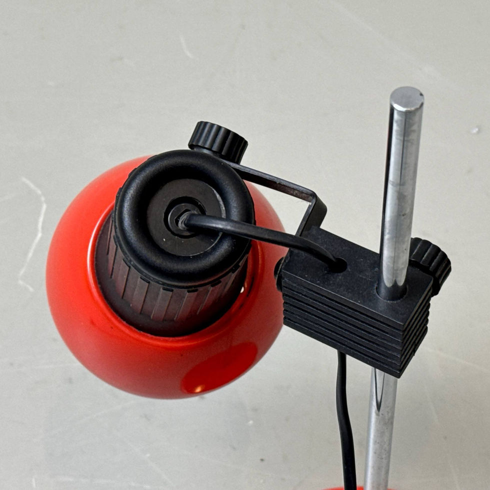 Markante Tischleuchte mit klarer, funktionaler Formsprache im Stil der 1970er Jahre. Der kugelartig gerundete, rot lackierte Metallschirm sitzt auf einem schwarzen, geriffelten Kunststoffelement und ist seitlich an einer verchromten Metallstange befestigt. Die Kombination aus kräftigem Rot, mattem Schwarz und kühlem Chrom erzeugt einen spannungsvollen, typisch industriell geprägten Kontrast. Der Leuchtenkopf ist verstellbar und lässt sich über eine seitliche Klemmbefestigung in der Höhe variieren. Ein gerippter Kunststoffblock fixiert die Position an der vertikalen Stange, wodurch die Lichtquelle flexibel ausgerichtet werden kann – ideal als Schreibtisch-, Lese- oder Akzentleuchte. Der runde Standfuss in Rot greift die Formensprache des Schirms auf und sorgt für einen stabilen Stand. Geschaltet wird die Leuchte über einen praktischen Schnurschalter.