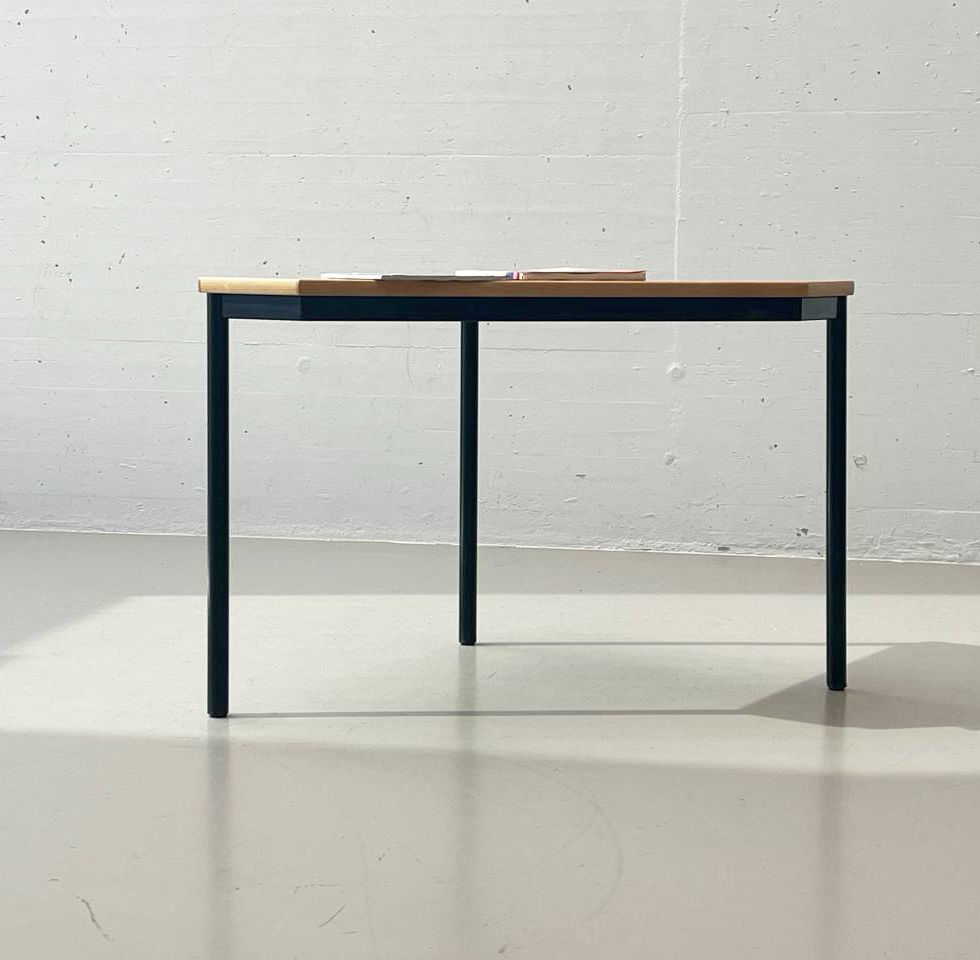 Das Untergestell besteht aus einem stabilen, schwarz lackierten Metallrahmen mit runden Beinen. Der Kontrast zwischen der hellen Holzplatte und den dunklen Beinen betont die funktionale, klare Gestaltung, die an Schul- oder Objekttische des späten 20. Jahrhunderts erinnert. Der Tisch wirkt durch seine kompakte Form vielseitig einsetzbar – sei es als kleiner Beistelltisch, als Teil eines modularen Systems oder als Solitärmöbel in modernen wie auch minimalistischen Einrichtungen.