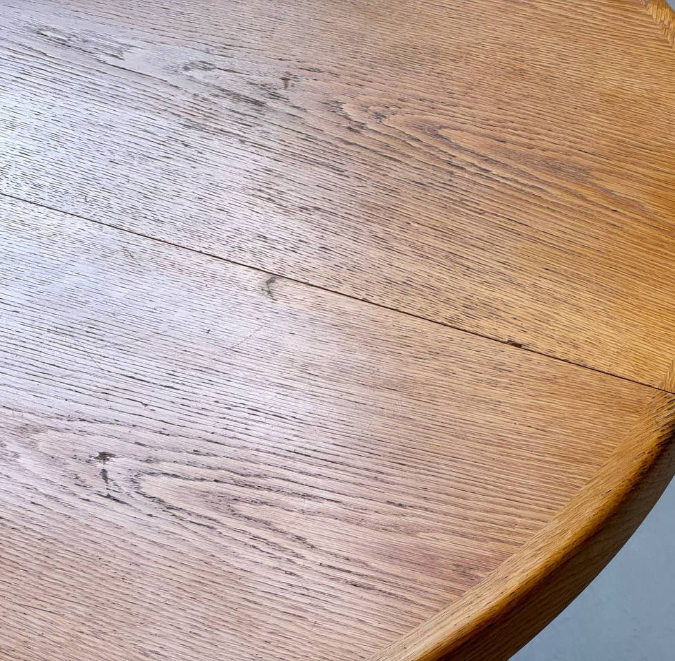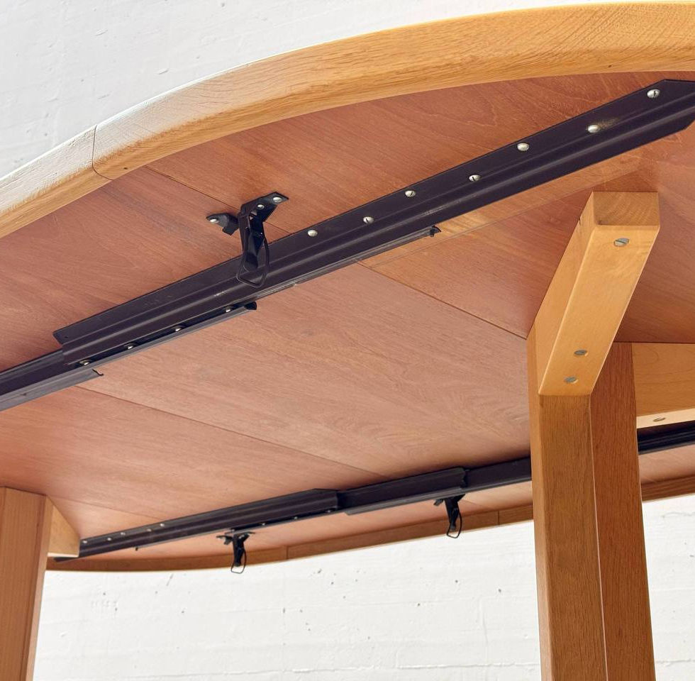 Schlichter, funktionaler Ausziehtisch aus massiver Eiche mit runder Grundform und stabiler, kreuzförmiger Fusskonstruktion. Die warme, gleichmässig gemaserte Tischplatte lässt sich über zwei Einlegeplatten flexibel vergrössern, wodurch der Tisch sich sowohl für kompakte Räume als auch für grössere Runden eignet. Die klare Linienführung und das robuste Untergestell verleihen ihm einen zeitlosen Charakter im Stil der 1970er Jahre.