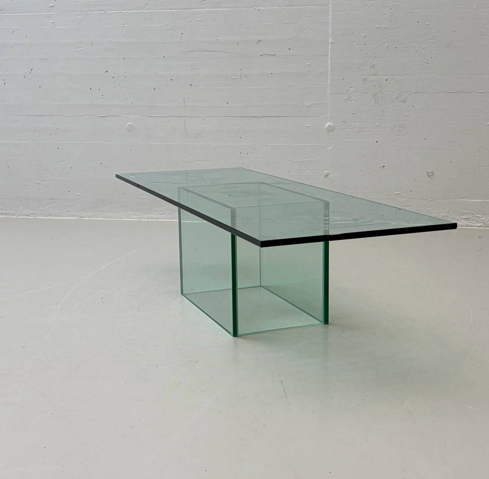 Dieser flach gehaltene Couchtisch besticht durch seine klare, architektonische Formensprache und die konsequente Verwendung von starkem Klarglas. Die rechteckige Tischplatte mit streifen finish liegt auf einem mittig platzierten, quaderförmigen Glaskörper auf, der zugleich als tragendes Element und visuelles Gegengewicht dient. Der Glaskörper ist hohl und hat keine geschlossene Unterseite, somit kann diese genutzt werden um ein Deko-Element einzubinden. Die grünlich schimmernden Glaskanten sind hochwertiges Floatglas und verleihen dem Tisch eine elegante Leichtigkeit. Durch die reduzierte Konstruktion und die präzise Verarbeitung wirkt das Design zeitlos und fügt sich sowohl in minimalistische als auch in moderne Interieurs harmonisch ein.