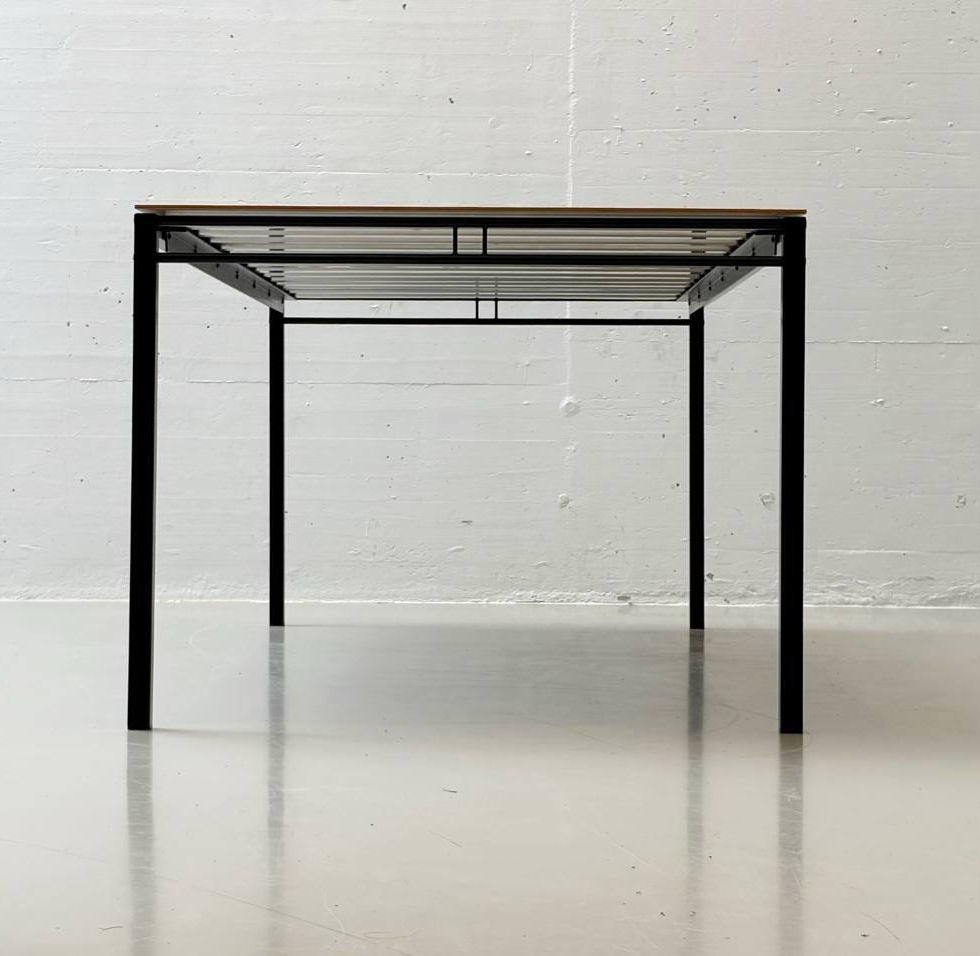 Zustand: Guter, gebrauchter Zustand mit altersbedingten Gebrauchsspuren. Die Tischplatte zeigt leichte Kratzer und kleinere Druckstellen, die dem Stück eine authentische Vintage-Patina verleihen. Das Stahlgestell ist stabil, mit dezenten Gebrauchsspuren im Lack, insgesamt gepflegt und voll funktionsfähig.