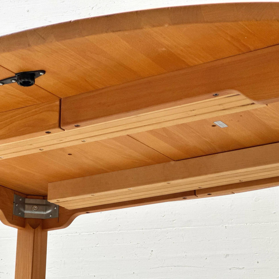 Ovaler Esstisch des dänischen Herstellers Gramrode Møbelfabrik, ausgeführt in massivem Buchenholz mit warmem, honigfarbenem Ton. Die weich auslaufende, ovale Tischplatte wird von elegant zulaufenden Beinen getragen, die sich harmonisch in die leicht geschwungene Zarge einfügen – typisch für das organisch reduzierte dänische Design der 1960er Jahre. Der Tisch verfügt über einen integrierten Ausziehmechanismus mit innenliegenden Führungsschienen. Die Einlegeplatten sind nicht vorhanden, der Mechanismus funktioniert jedoch einwandfrei. Dadurch bleibt die elegante Grundform erhalten, während sich optional eine Erweiterung realisieren lässt. Die Oberfläche zeigt die charakteristische, ruhige Maserung der Buche mit dezentem Farbspiel zwischen helleren und leicht rötlichen Partien. Unterseitig mit Herstelleretikett „Gramrode Møbelfabrik – Denmark“ versehen.
