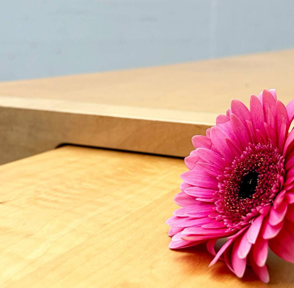 Schlichter Esstisch aus hell lackiertem Holz mit klarer skandinavischer Linienführung und typischen Fingerzinken an den Ecken. Die flach gehaltene Tischplatte zeigt eine ruhige Maserung, während die kantigen Beine in charakteristischen, integrierten Holzrollen enden. Durch die seitlich ausziehbare Zusatzplatte lässt sich der Tisch um 50 cm verlängern – ein funktionales Detail des 1996 eingeführten Modells Pelto.