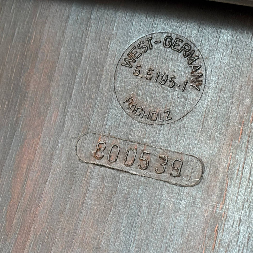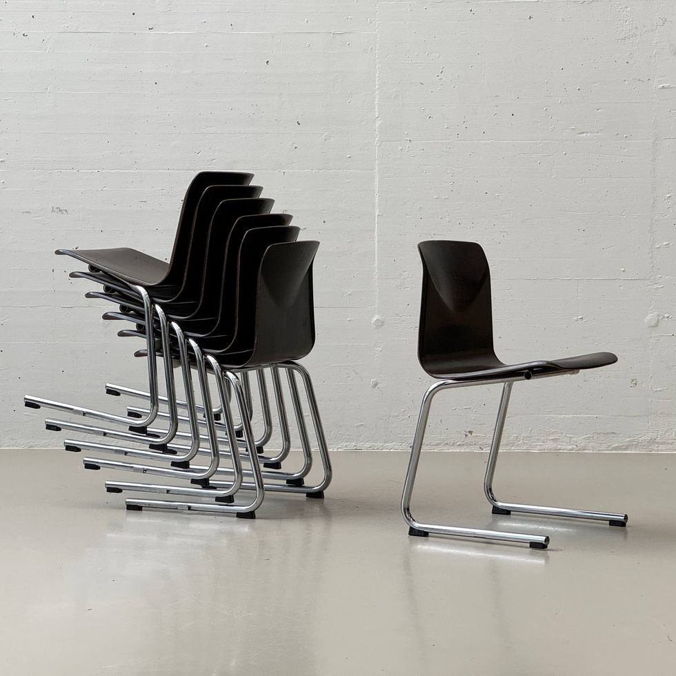 Klassische Freischwinger Stühle aus Westdeutscher Produktion von Thur-Op-Seat, gefertigt aus gebogenem Stahlrohrgestell mit dunkel gebeizter Pagholz-Sitzschale. Die organisch geformte Sitzfläche mit leicht flexender Rückenlehne sorgt für hohen Sitzkomfort, während das verchromte Kufengestell die typische Bauhaus-inspirierte Leichtigkeit vermittelt. Die Stühle sind stapelbar und damit ideal für flexible Wohn- oder Objektbereiche. Besonders charakteristisch ist das widerstandsfähige Pagholz – ein hochverdichtetes Holzmaterial, das für seine Robustheit und Langlebigkeit bekannt ist und häufig im Objektbereich eingesetzt wurde. Ein zeitloser Entwurf zwischen funktionalem Mid-Century Design und industrieller Ästhetik – vielseitig kombinierbar, sowohl im privaten Essbereich als auch im Studio oder Office.