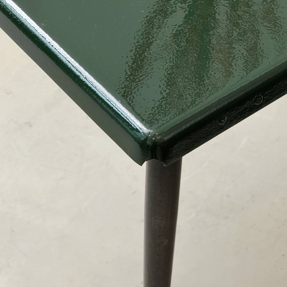 Dieser funktional und zugleich charakterstark gestaltete Gartentisch steht exemplarisch für die robuste Outdoor-Ästhetik der 1960er bis 1970er Jahre. Die quadratische Tischplatte aus dunkelgrün beschichtetem Pagholz zeigt eine leicht strukturierte, widerstandsfähige Oberfläche, die speziell für den Einsatz im Aussenbereich konzipiert wurde. Pagholz – ein unter Hochdruck gepresstes Schichtholzmaterial – war insbesondere in der Nachkriegszeit für seine extreme Belastbarkeit, Witterungsresistenz und Langlebigkeit bekannt und wurde häufig im Objekt- und Gastronomiebereich eingesetzt. Das minimalistische Untergestell aus schwarz lackiertem Stahlrohr bildet einen spannenden Kontrast zur satten Farbigkeit der Platte und unterstreicht den klaren, industriellen Charakter des Entwurfs. Die schlanken Beine mit leicht ausgestellten Enden sorgen für Stabilität und eine visuelle Leichtigkeit zugleich. Die Konstruktion ist bewusst einfach gehalten, was nicht nur die Funktionalität betont, sondern auch den zeittypischen Fokus auf reduzierte, langlebige Materialien widerspiegelt.