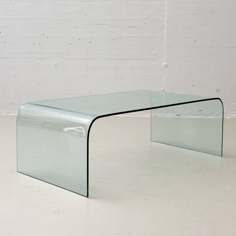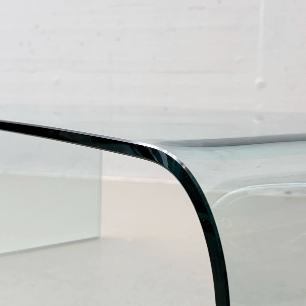 Eleganter Couchtisch aus durchgehend gebogenem Floatglas, gefertigt aus einem einzigen Stück und mit sauber ausgeführten Radien an den Seiten. Die minimalistische Formgebung und die leicht grünlich schimmernde Glaskante sind typisch für italienische Glasmanufakturen der 1970er/80er Jahre, die sich auf das thermische Biegen von Massivglas spezialisiert haben. Die klare, skulpturale Linienführung verleiht dem Tisch eine schwebende Leichtigkeit und macht ihn zum vielseitigen Klassiker in modernen wie auch historischen Interieurs.