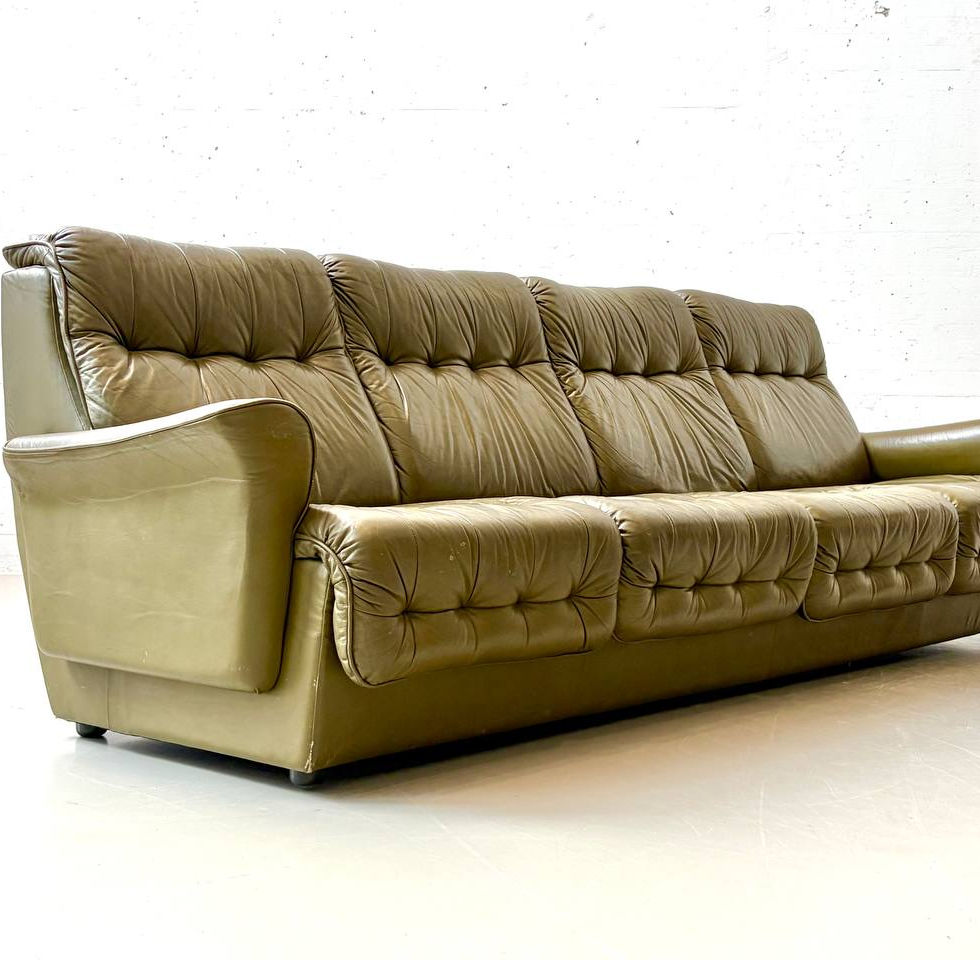 Markantes 4-Sitzer Ledersofa aus den 1970er Jahren mit charakterstarker Formensprache und hohem Sitzkomfort. Die weich gepolsterten Sitz- und Rückenelemente sind aufwendig geknöpft und verleihen dem Sofa seine typische, voluminöse Optik dieser Zeit. Der Bezug aus olivgrünem Leder zeigt eine schöne, lebendige Patina und unterstreicht den authentischen Vintage-Charakter. Die leicht glänzende Oberfläche sowie die feinen Falten und Gebrauchsspuren erzählen von der Qualität des Materials und seinem natürlichen Alterungsprozess. Besonders prägnant sind die breit ausgeformten Armlehnen und die niedrige, einladende Sitzhöhe, die zusammen mit der tiefen Polsterung für ein entspanntes, loungiges Sitzgefühl sorgen. Die klare Linienführung des Korpus wird durch die weichen Formen elegant gebrochen – ein typisches Merkmal hochwertiger Sofas dieser Epoche. Dank seiner grosszügigen Proportionen eignet sich dieses Sofa ideal als zentrales Statement-Piece im Wohnraum – perfekt für Mid-Century, Space Age oder 70s Interiors.