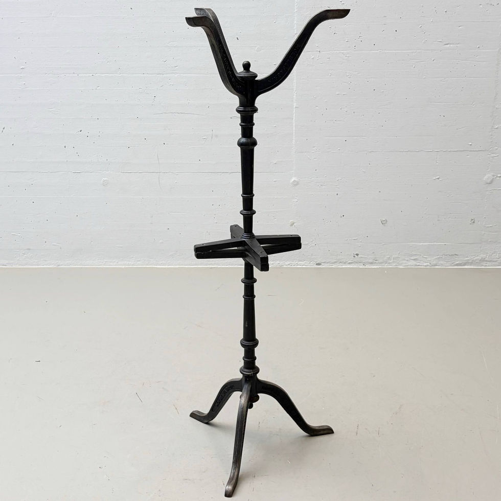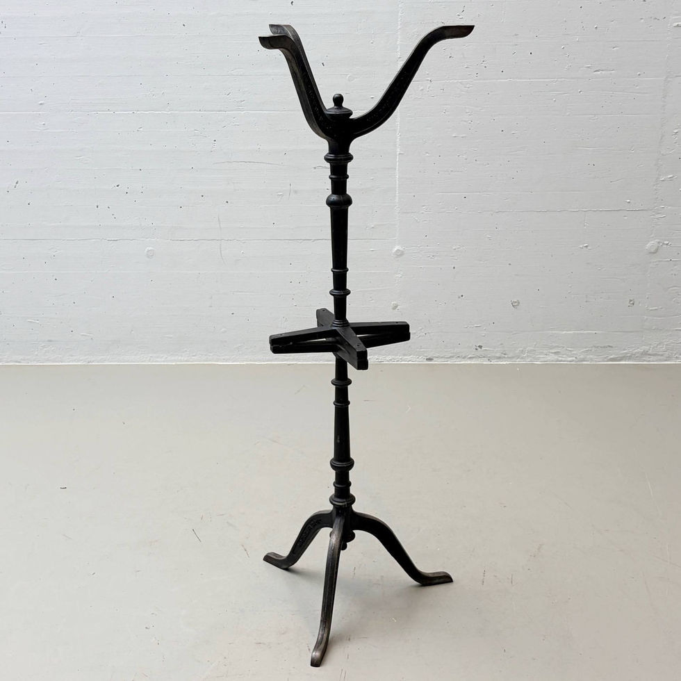Die Konstruktion besteht aus massivem Gusseisen, schwarz lackiert, mit fein ausgearbeiteten Details und stilisierten Rundprofilen entlang des zentralen Säulenelements. Der dreibeinige Fuss läuft elegant geschwungen aus und sorgt durch seine Masse für hohe Standfestigkeit. In den Armen ist der Schriftzug MOEBELFABRIK HORGEN-GLARUS AG eingegossen – ein charakteristisches Merkmal dieser frühen Serienfertigungen und zugleich ein authentisches Zeugnis Schweizer Industriegeschichte.