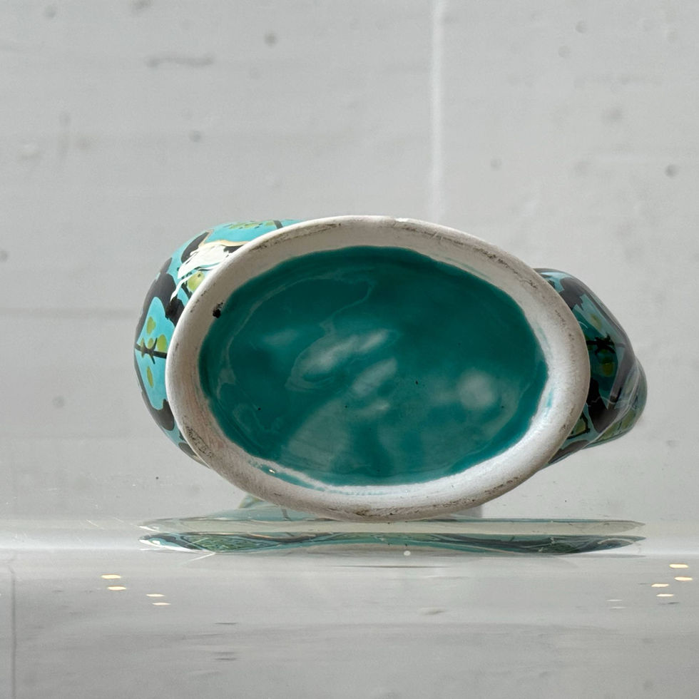 Ausdrucksstarke, skulpturale Keramikvase aus der Werkstatt von Azouz Kharraz in Bizerte, Tunesien. Die aussergewöhnliche Form mit geschwungenem Henkel und leicht gefalteter, organischer Öffnung verleiht dem Objekt eine fast figürliche Präsenz und hebt es klar von klassischen Vasenformen ab. Die intensiv türkisfarbene Glasur wird von freien, grafischen Ornamenten in Schwarz sowie punktierten und floralen Elementen in Grün und feinen goldfarbenen Akzenten durchzogen. Das Dekor erinnert an abstrahierte Pflanzen- und Symbolformen und verbindet traditionelle nordafrikanische Muster mit einer überraschend modernen, fast postmodernen Anmutung. Besonders der fliessende Übergang zwischen Körper und Henkel sowie die asymmetrische Silhouette unterstreichen den handwerklichen Charakter und machen die Vase zu einem eigenstaendigen Designobjekt mit starkem Ausdruck. Als Solitär oder in Kombination mit anderen Keramikobjekten setzt dieses Stück einen markanten, farbintensiven Akzent im Raum.