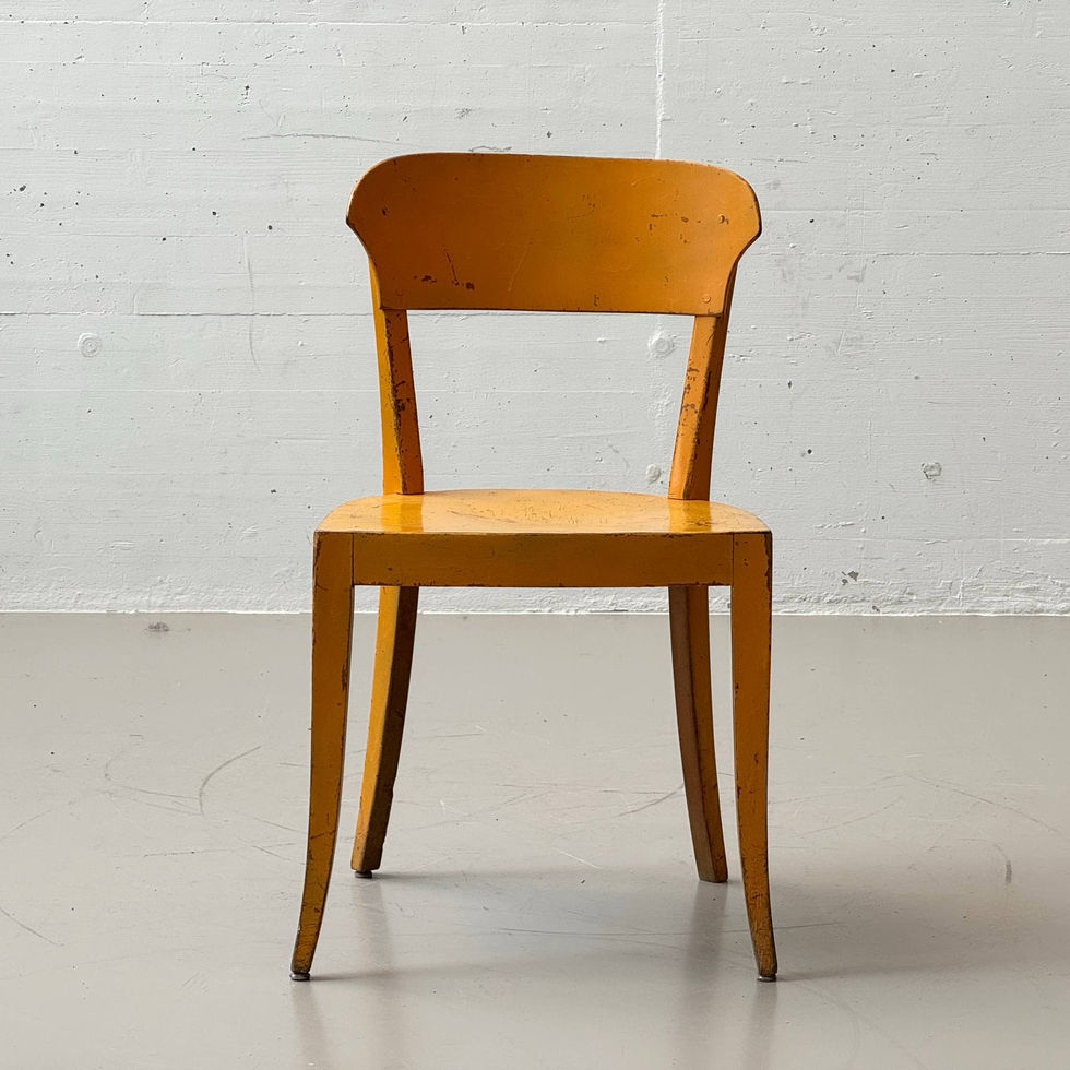 Zustand: Gebrauchter Zustand mit altersbedingten Spuren. Gelber Lack mit vereinzelten Abrieben, kleinen Kantenstellen und leichten Druckspuren, teils mit minimalem Durchscheinen der ursprünglichen Oberfläche sowie aufkleber auf der Rückenlehne des Stuhls. Konstruktion stabil und solide. Authentische Substanz mit charaktervoller Patina.