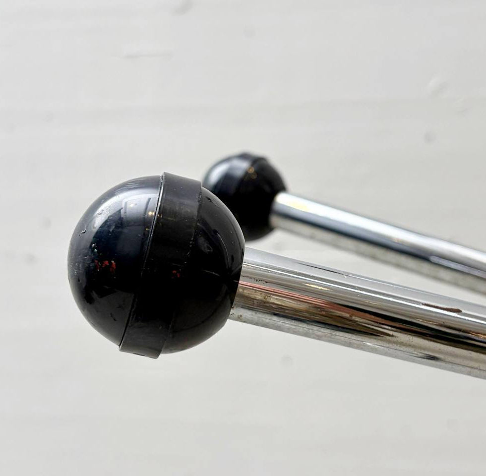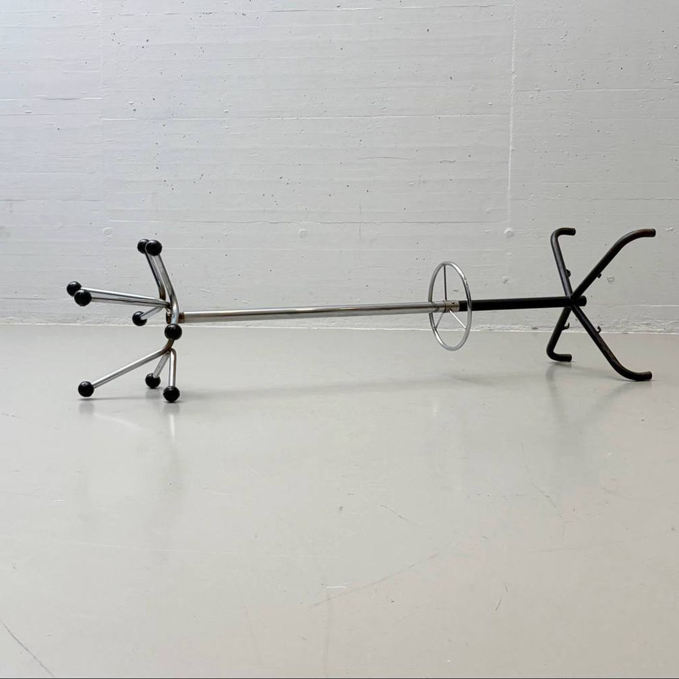 Charakteristische Garderobe aus gebogenem Stahlrohr mit umlaufendem Fussring und acht kugelförmigen Abschlussknöpfen aus schwarzem Kunststoff. Das klare, funktionale Design mit dreibeinigem Standfuss stammt aus dem industriellen Umfeld der 1950er/60er Jahre und erinnert an Ausstattungselemente aus Werkhallen, Schulen oder öffentlichen Gebäuden. Die Mischung aus verchromten und schwarz lackierten Stahlteilen verleiht dem Stück seinen typischen, leicht technischen Look und macht es zu einem authentischen Zeitzeugnis Schweizer Gebrauchsgestaltung.