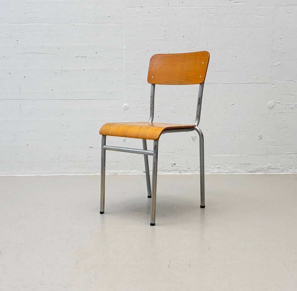 Das Gestell besteht aus verchromtem oder galvanisch verzinktem Rundstahlrohr, das stabil verschweisst ist und für hohe Belastbarkeit sorgt. Sitz und Rückenlehne sind aus formverleimtem Buchenschichtholz gefertigt, das eine angenehme, ergonomische Sitzform bietet. Die leicht nach hinten geneigte Rückenlehne sowie die abgerundete Sitzvorderkante sind typische Merkmale von Schul- und Kantinenstühlen der Nachkriegsmoderne.