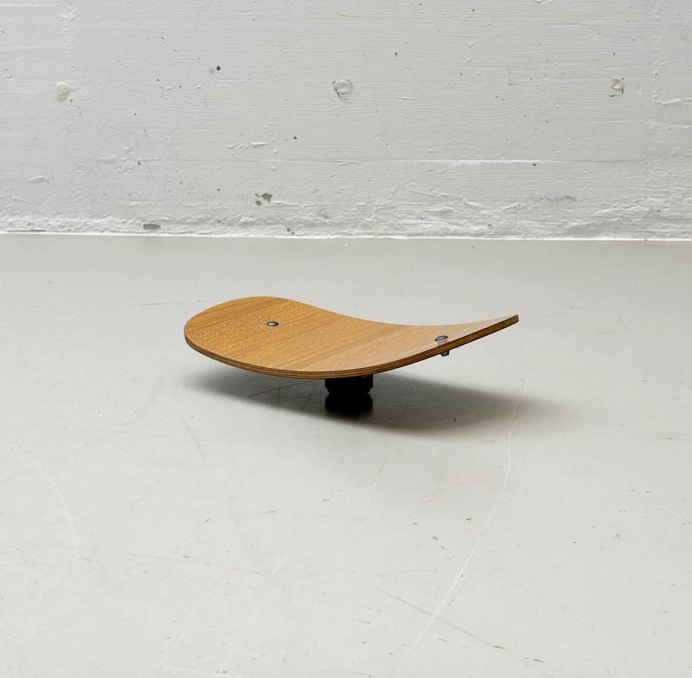 Das Gestell besteht aus einem massiven, pulverbeschichteten Stahlrohr in pyramidenförmiger Struktur, was dem Stuhl hervorragende Stabilität und Standfestigkeit verleiht. Die Sitzhöhe ist über eine Schraubmechanik verstellbar und wird durch eine Sicherungskette fixiert – ein klassisches Merkmal industrieller Fertigungsmöbel jener Epoche. Sitz und Rückenlehne sind aus formverleimtem Schichtholz gefertigt und mit einer Nussbaum-Imitat-Beschichtung versehen, die einen warmen Kontrast zum kühlen Metall bildet.