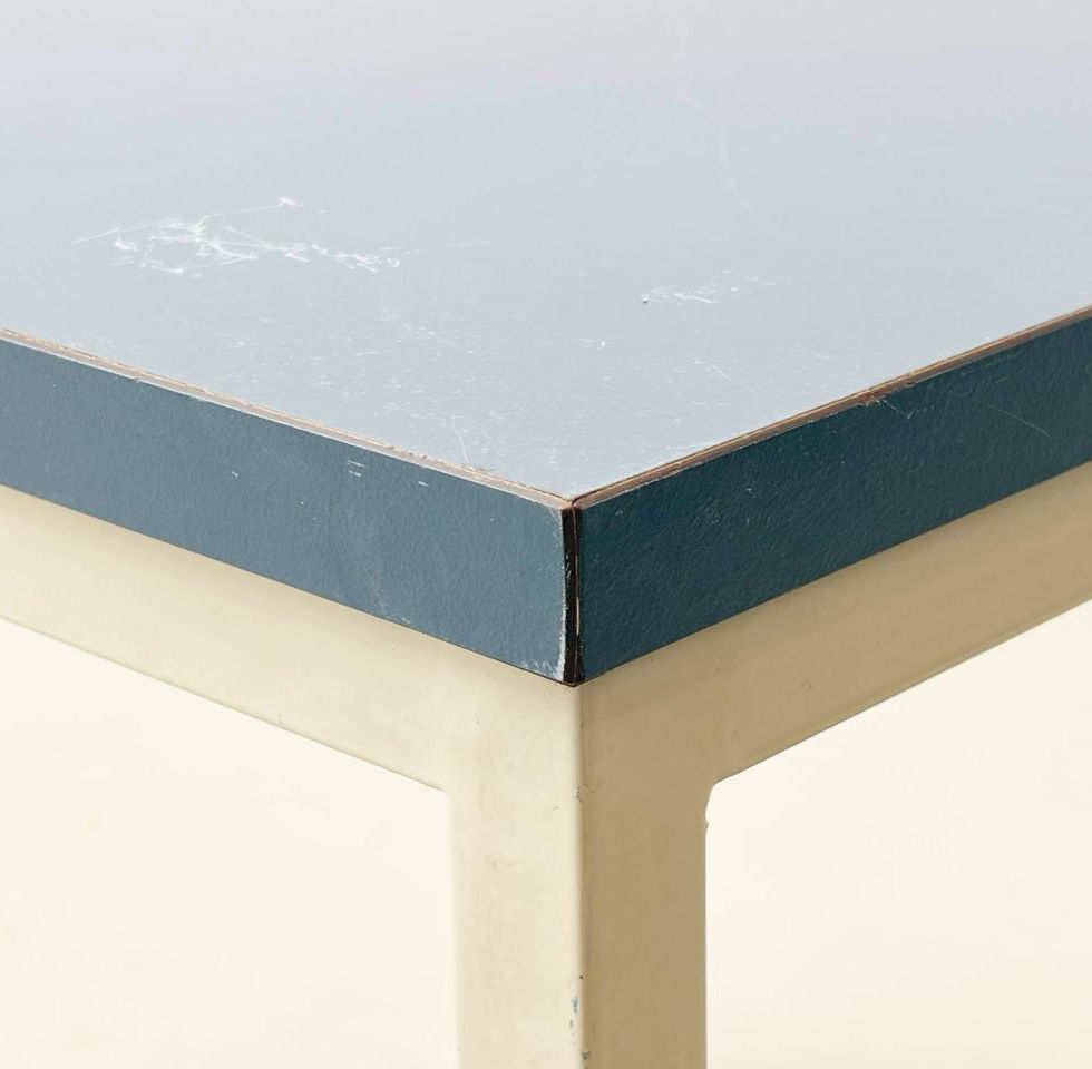Schlichter, funktionaler Beistelltisch aus früher Industriefertigung, ausgeführt mit einer dunkelblauen Laminatplatte und hellem, cremefarben lackiertem Stahlgestell. Die Konstruktion ist bewusst reduziert gehalten und erinnert an klassische Schweizer Schul- und Labormöbel dieser Zeit. Die sichtbare Nummerierung 1021–25 unterstreicht den Werkstatt- und Archivcharakter des Stücks.