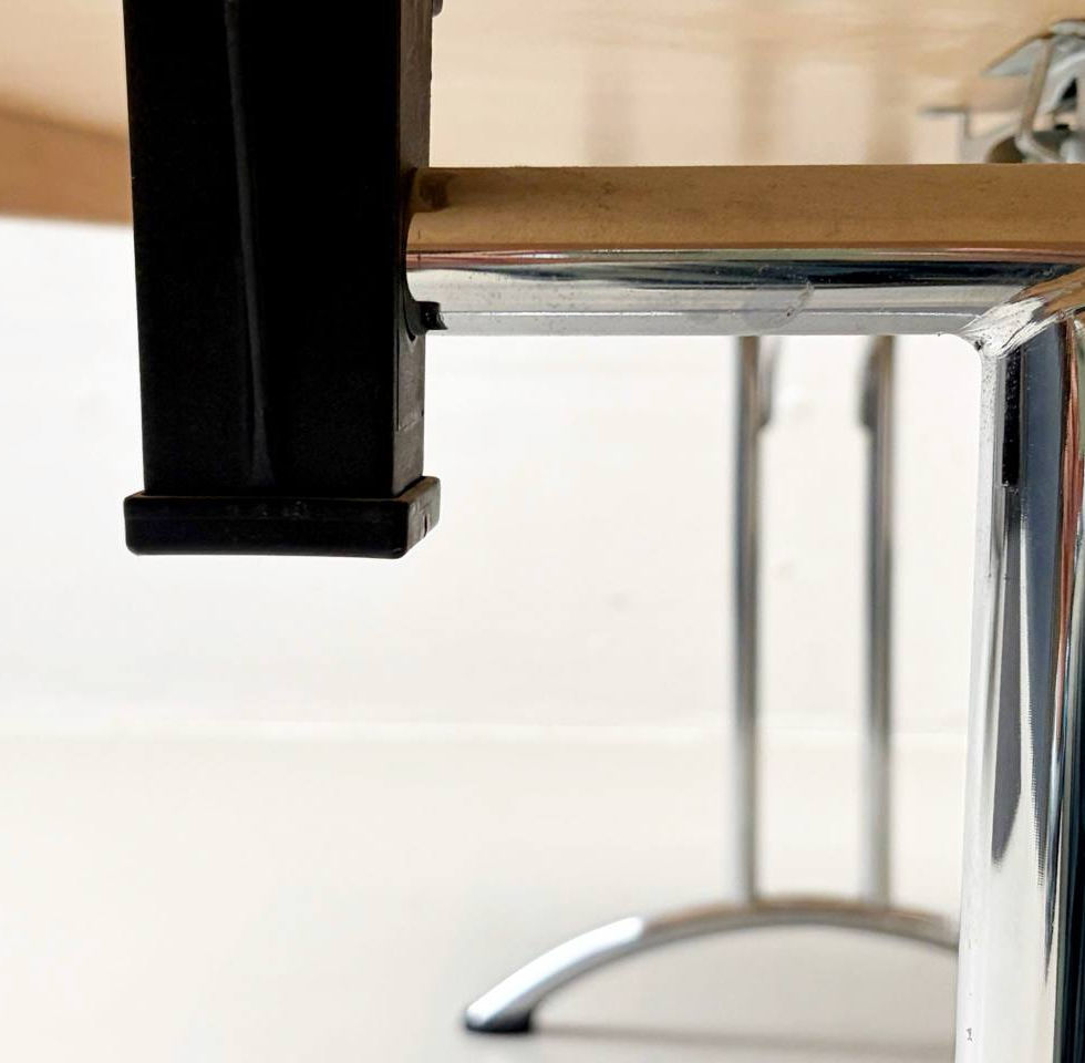 Dieser funktionale Klapptisch aus industrieller Serienfertigung besticht durch eine pflegeleichte, hell gemaserte Melaminharz-Tischplatte in Buchenoptik und ein verchromtes Stahlrohruntergestell mit charakteristisch gebogenen Fussstreben. Die klare Linienführung, die robuste Materialkombination aus Chrom und Kunststoffbeschichtung sowie der praktische Klappmechanismus machen ihn zu einem vielseitigen Klassiker für Seminarraeume, Ateliers, Vereinslokale oder das Home-Office. Dank einklappbarer Beine lassen sich die Tische platzsparend lagern und effizient transportieren.
