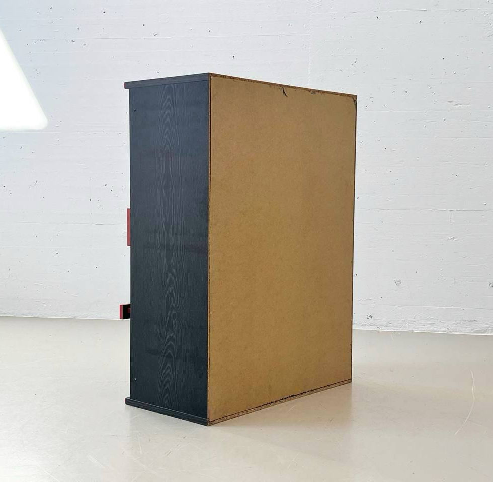 Besonders prägnant ist der Kontrast aus schwarzer Holzmaserung und den klaren roten Kanten, die dem Möbel einen fast grafischen Charakter im Stil der 1980er-Jahre verleihen. Diese Farb- und Formensprache erinnert an postmoderne Entwürfe der Memphis-Bewegung, die mit starken Farbkontrasten und reduzierten Geometrien arbeiteten. Gleichzeitig ist das Möbel funktional und kompakt gehalten, sodass es auch in kleineren Wohnsituationen eingesetzt werden kann.