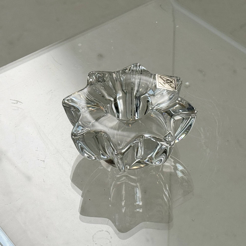 Dieser skulpturale Kerzenständer aus massivem Kristallglas greift formal die charakteristische Designsprache des französischen Glaskuenstlers Pierre D’Avesn auf, dessen Entwuerfe bereits in den 1930er und 1940er Jahren durch ihre plastischen, gerippten Strukturen bekannt wurden. Die dynamisch gefaltete, sternförmige Silhouette erinnert an eine geöffnete Blüte und verleiht dem Objekt eine fast organische Lebendigkeit.