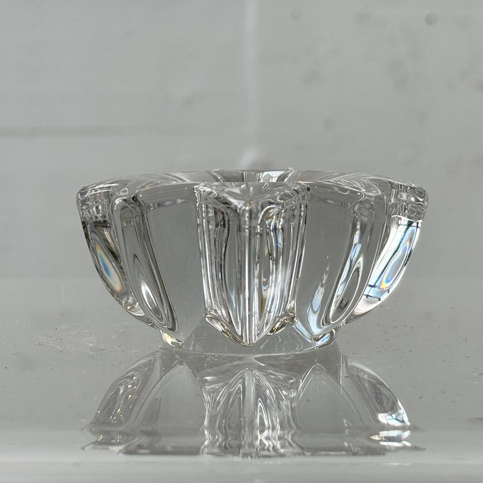 Der massiv ausgearbeitete Glaskörper zeigt ausgeprägte Rippenstrukturen, die das Licht vielfach brechen und für lebendige Reflexionen sorgen. Die zentrale Kerzenaufnahme ist tief eingelassen und wird von den weich verlaufenden Kanten elegant eingerahmt. Durch das hohe Gewicht und die präzise Verarbeitung entsteht eine hochwertige, nahezu skulpturale Wirkung.
