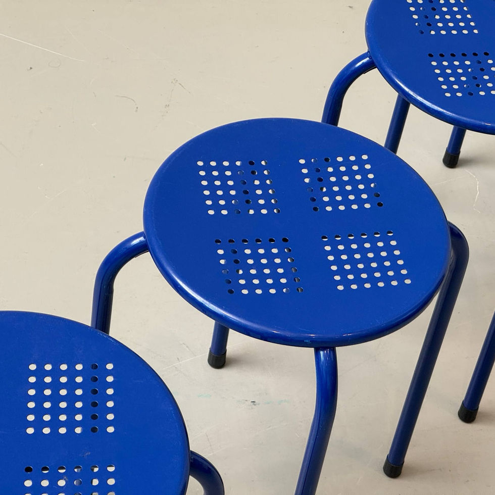 Klassische Metallhocker des Schweizer Herstellers Landi, ausgeführt in kräftiger, heute nicht mehr produzierter Blaunuance. Die runde Sitzfläche aus gelochtem Stahlblech zeigt das charakteristische Vierer-Raster aus Perforationen und sorgt für Belüftung sowie eine grafisch reduzierte Anmutung. Das Gestell besteht aus gebogenem Stahlrohr mit schwarzer Fusskappe, stabil verschweisst und auf hohe Alltagstauglichkeit ausgelegt. Die Hocker sind stapelbar und lassen sich platzsparend verstauen – ideal für Atelier, Werkstatt, Gastronomie oder als farblicher Akzent im Wohnbereich. Die industrielle Formsprache verweist auf funktionales Schweizer Design mit klarer Linie und robustem Charakter.