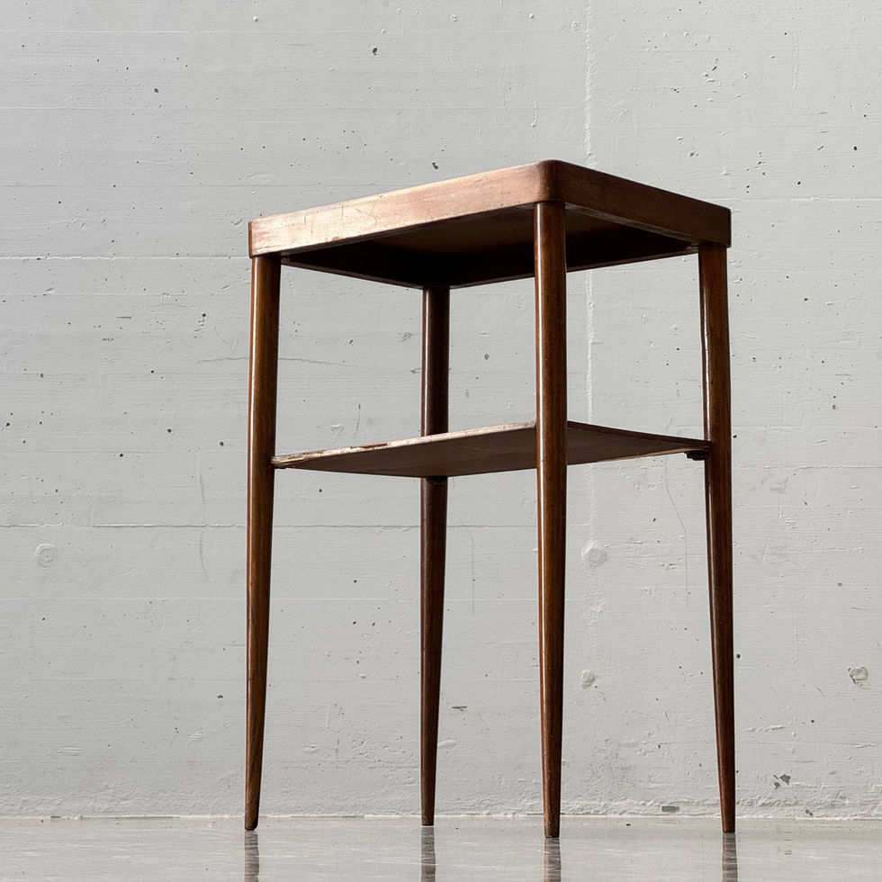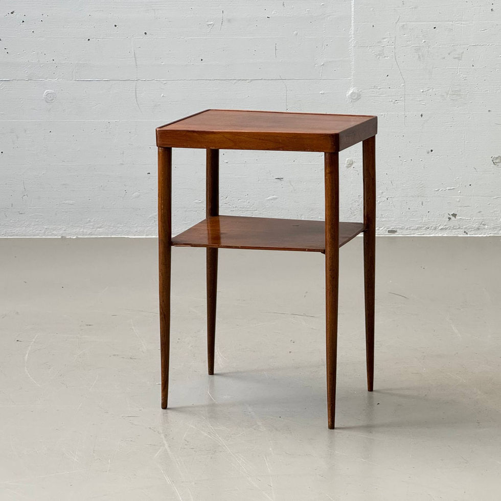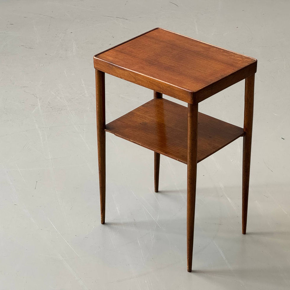 Eleganter Mid-Century Beistelltisch in klassischer skandinavischer Formsprache der 1960er Jahre, gefertigt aus warmtonigem Holz mit schöner, lebendiger Maserung. Die fein verjüngten Rundbeine verleihen dem Möbel eine besonders leichte und filigrane Erscheinung, während die weich gerundeten Kanten der Tischplatte den hochwertigen Charakter unterstreichen. Die obere Platte ist leicht eingefasst und wirkt dadurch wie ein dezentes Tablett, was dem Tisch eine angenehme Tiefe verleiht. Darunter befindet sich eine praktische Zwischenablage, die nicht nur funktionalen Stauraum bietet, sondern auch die Konstruktion optisch stabilisiert. Die Kombination aus schlanken Proportionen und klarer Linienführung macht dieses Möbel zu einem vielseitigen Begleiter – ideal als Beistelltisch neben Sofa oder Lounge Chair, als Nachttisch oder auch als dezentes Solitärstück im Raum.