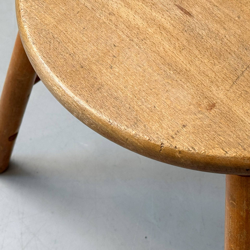 Charakteristischer holländischer Kinderstuhl aus der Mid-Century-Periode mit klarer, funktionaler Formensprache. Die runde Sitzfläche ruht auf vier leicht ausgestellten Rundholzbeinen und wird durch umlaufende Streben stabilisiert. Die gebogene Rückenlehne mit feinen Spindelstäben verleiht dem Stuhl eine luftige Anmutung und ist typisch für skandinavisch/ niederländische Entwürfe der 1950er Jahre. Die Proportionen sind bewusst niedrig gehalten und auf Kinder ergonomisch abgestimmt. Die gleichmässige, feine Maserung, die warme honigfarbene Tönung sowie die gedrechselten Rundstäbe und Beine sprechen klar für Buche, ein in den Niederlanden der Nachkriegszeit häufig eingesetztes Massivholz für Kinder- und Serienmöbel.