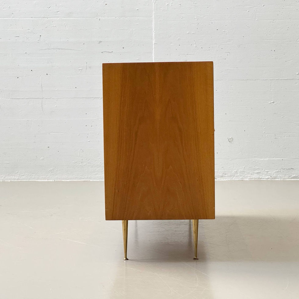 Elegantes Mid-Century Sideboard mit besonders feiner, dekorativer Gestaltung. Der Korpus ist mit warmtonigem Holzfurnier Kirschbaum ausgeführt, dessen lebendige Maserung dem Möbel eine ruhige und hochwertige Ausstrahlung verleiht. Auffällig sind die vertikalen Intarsienstreifen auf der Front, die in hellerem Holz eingelegt sind und dem Möbel eine subtile grafische Struktur geben – ein typisches Gestaltungselement vieler hochwertiger Möbel der 1950er und frühen 1960er Jahre. Die Front besteht aus zwei Türen mit schlanken, charakteristischen Metallbeschlägen und originalem Schlüssel. Hinter den Türen verbirgt sich ein funktional gestalteter Innenraum. Auf der linken Seite befindet sich ein grosses Fach mit Einlegeboden, das vielseitigen Stauraum für Geschirr, Bücher oder Alltagsgegenstände bietet. Die rechte Seite ist mit kleineren Ablageflächen ausgestattet, die sich besonders gut für Flaschen, Gläser oder kleinere Gegenstände eignen – eine typische Aufteilung vieler damaliger Bar- oder Anrichte-Sideboards. Besonders elegant wirkt das Möbel durch seine filigranen, konisch zulaufenden Messingbeine, die dem Sideboard eine sehr leichte und schwebende Wirkung verleihen. Diese feinen Metallfüsse sind ein charakteristisches Detail der Mid-Century Gestaltung und verleihen dem Möbel einen leicht luxuriösen Akzent. Durch seine kompakten Proportionen eignet sich das Sideboard ideal als kleinere Anrichte im Wohn- oder Essbereich, aber auch als stilvolle Bar oder TV-Möbel.