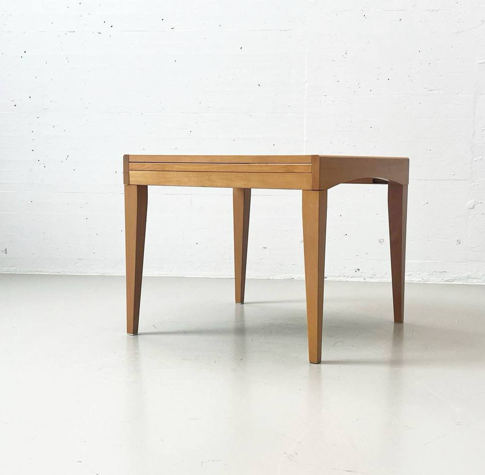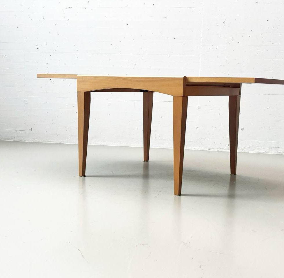 Im nicht ausgezogenen Zustand nimmt der Tisch wenig Platz ein und eignet sich somit perfekt für kleinere Räume. Im ausgezogenem Zustand verwandelt er sich in einen vollwertigen Esstisch mit grosszügiger Fläche. Die Oberfläche besteht aus mehreren Holzpanelen mit gleichmässiger Maserung, was dem Tisch eine harmonische Optik verleiht.