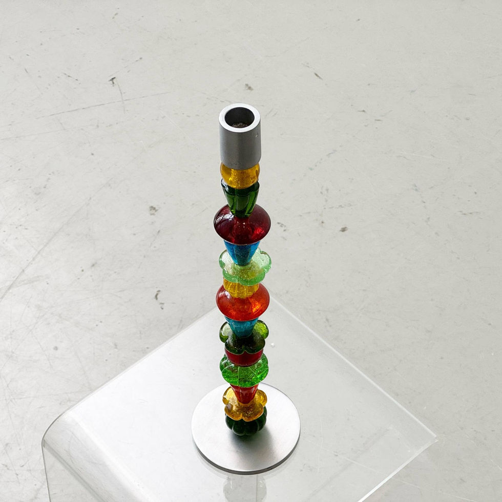 Ausdrucksstarker Kerzenständer von Räder Design mit klarer, moderner Formsprache und lebendiger Farbwirkung. Die Kombination aus farbigem Glas und gebürstetem Aluminium verleiht dem Objekt eine spannende Materialität und setzt gezielte Akzente im Raum. Die schlanke, vertikale Silhouette wird durch die intensive Hauptfarbe Rot geprägt, die durch transparente Farbsegmente in Gelb, Grün und Blau ergänzt wird. Je nach Lichteinfall entstehen wechselnde Reflexionen und ein lebendiges Farbspiel, das den Kerzenständer sowohl im Tageslicht als auch bei Kerzenschein besonders wirkungsvoll erscheinen lässt.