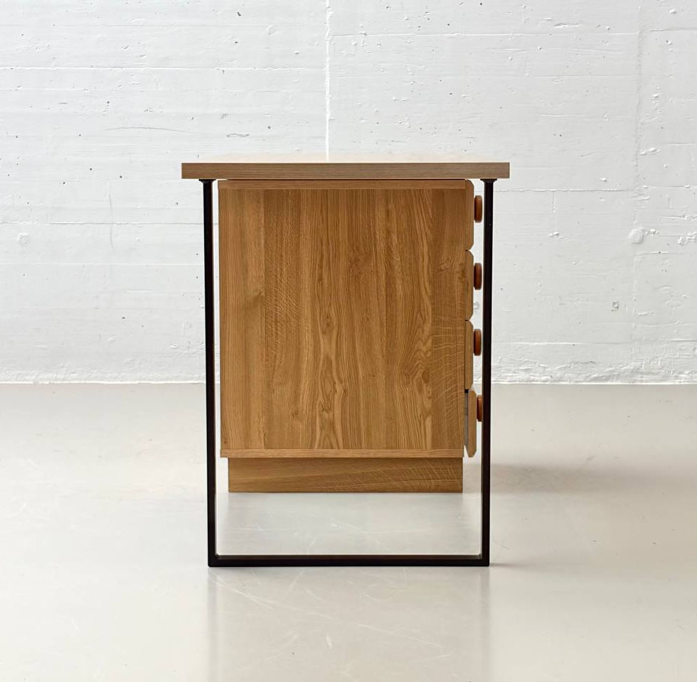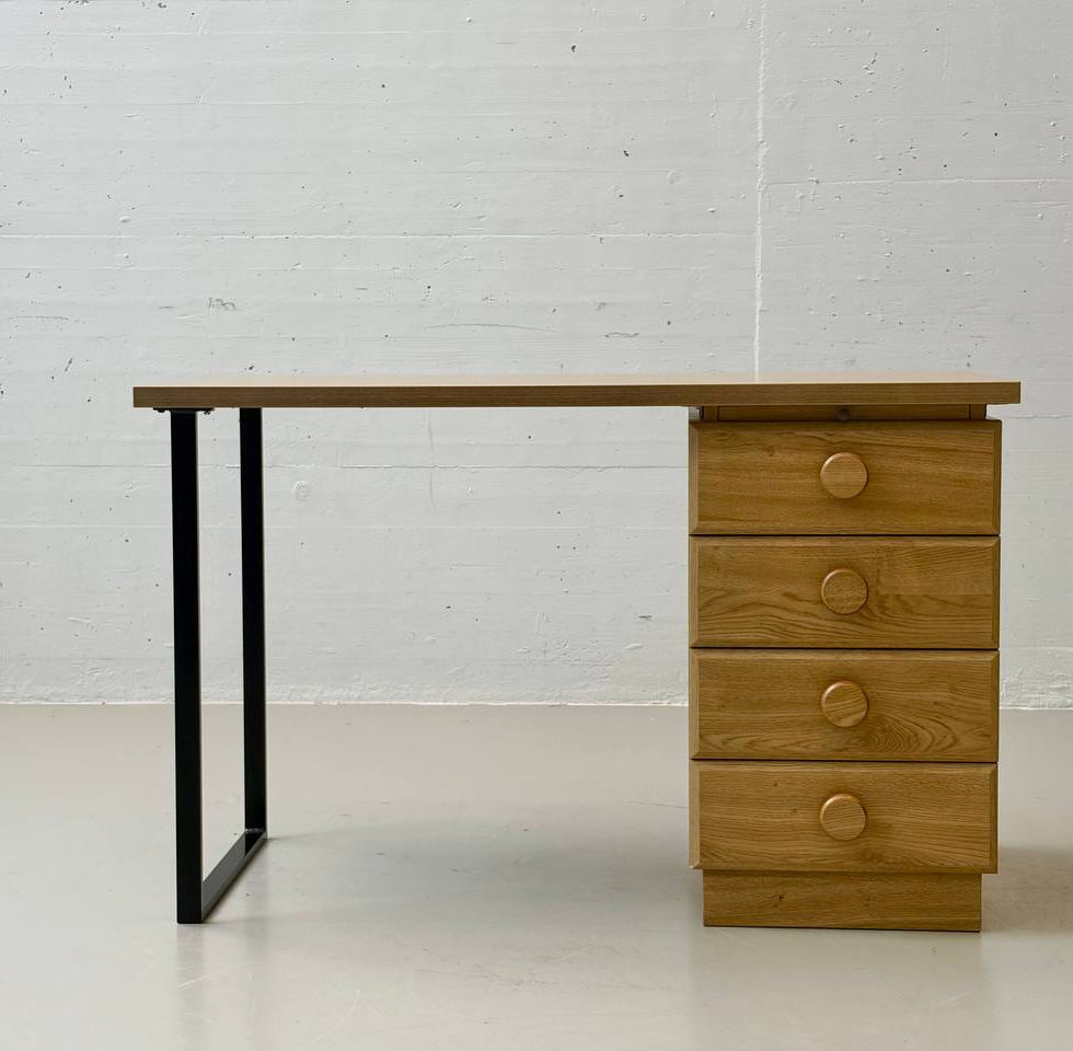 Moderner Schreibtisch mit klarer, reduzierter Formensprache und funktionalem Aufbau. Die Kombination aus warmem Holzton und schwarzem Metallgestell verleiht dem Möbelstück einen zeitlosen, leicht industriellen Charakter. Die Tischplatte ist mit einem integrierten Schubladenelement ausgestattet, das zusätzlichen Stauraum bietet. Besonders praktisch ist die obere Schublade mit Einteilung, ideal für Bürobedarf oder kleinere Gegenstände. Die weiteren Schubladen sorgen für Ordnung und machen den Tisch sowohl für den Arbeitsbereich als auch für den Wohnraum vielseitig einsetzbar. Das filigrane Metallgestell auf der einen Seite schafft optische Leichtigkeit, während das kompakte Korpuselement auf der anderen Seite Stabilität und Funktionalität vereint.