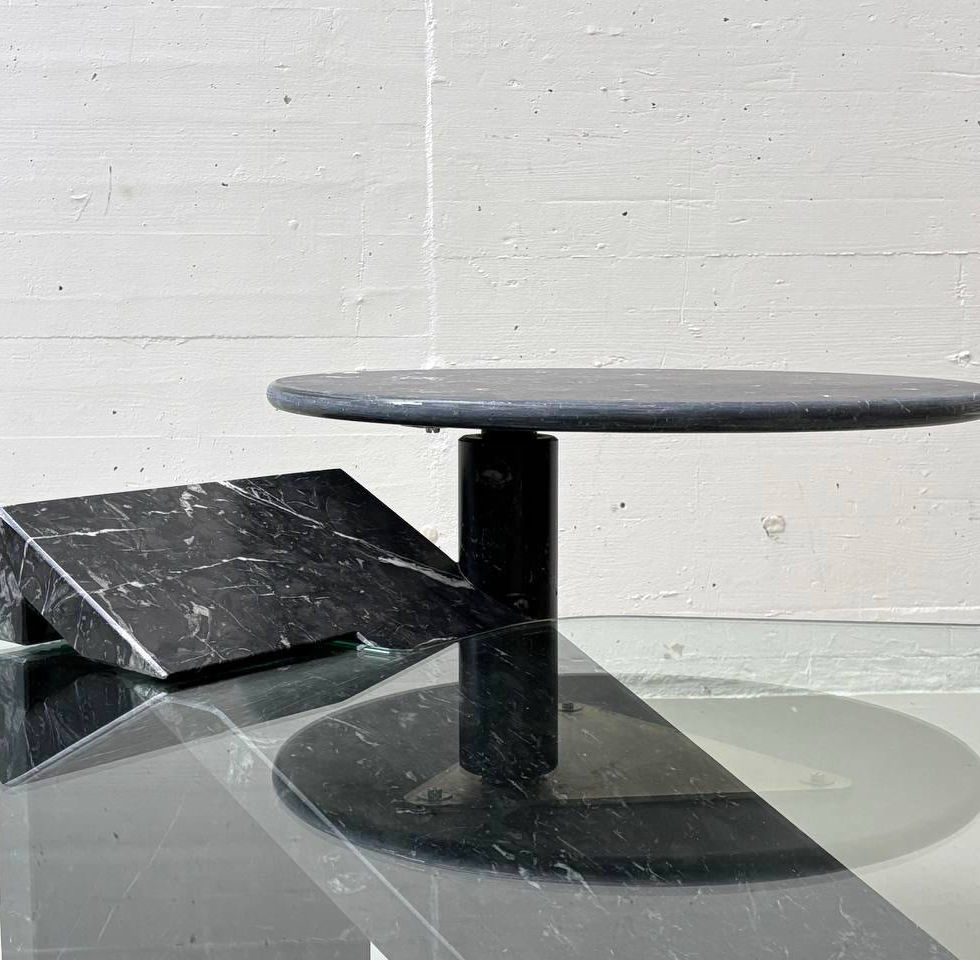 Die klare Geometrie und das Zusammenspiel von Glas und Naturstein verleihen dem Tisch eine elegante, zeitlose Ausstrahlung. Ein Etikett auf der Unterseite weist auf ein Herstellungsdatum vom 15. März 1994 hin, was auf ein Stück aus einer früheren Designära schließen lässt. Insgesamt vereint dieser Tisch funktionale Vielseitigkeit mit einem starken ästhetischen Ausdruck und eignet sich ideal als stilvoller Mittelpunkt in einem modernen Wohnambiente.