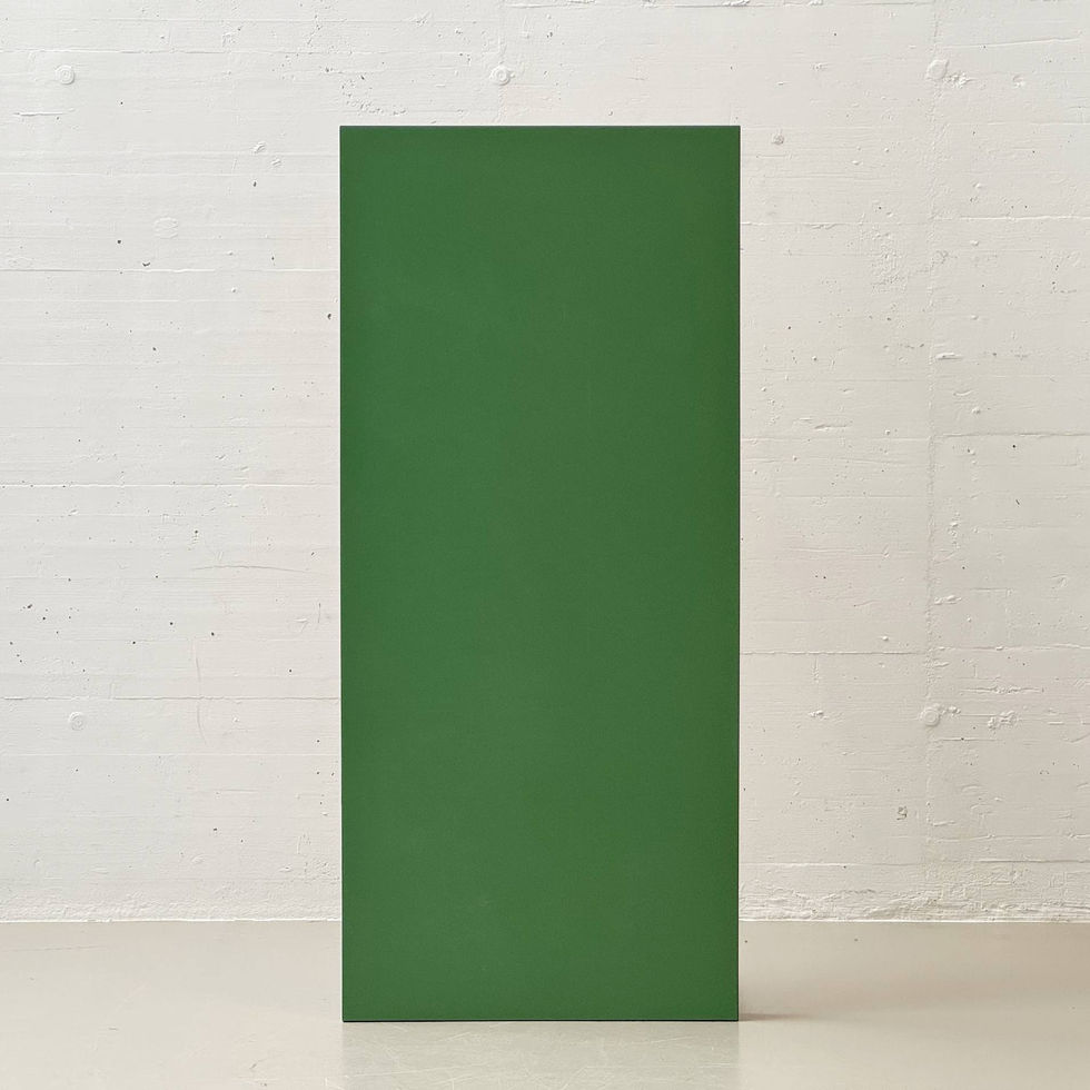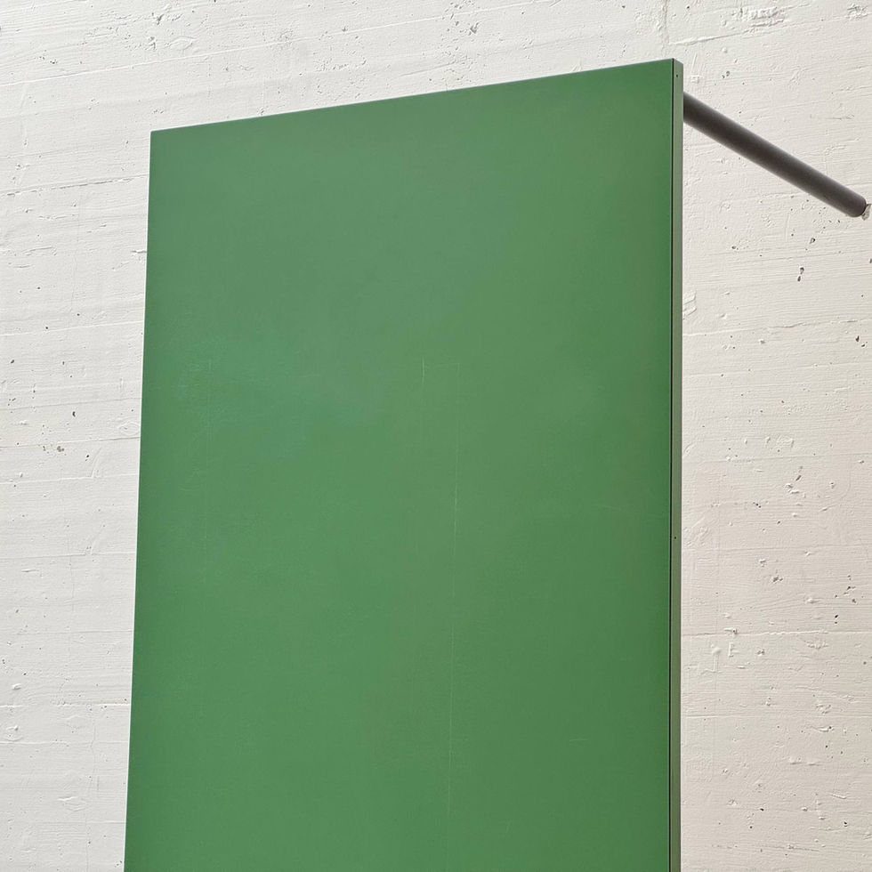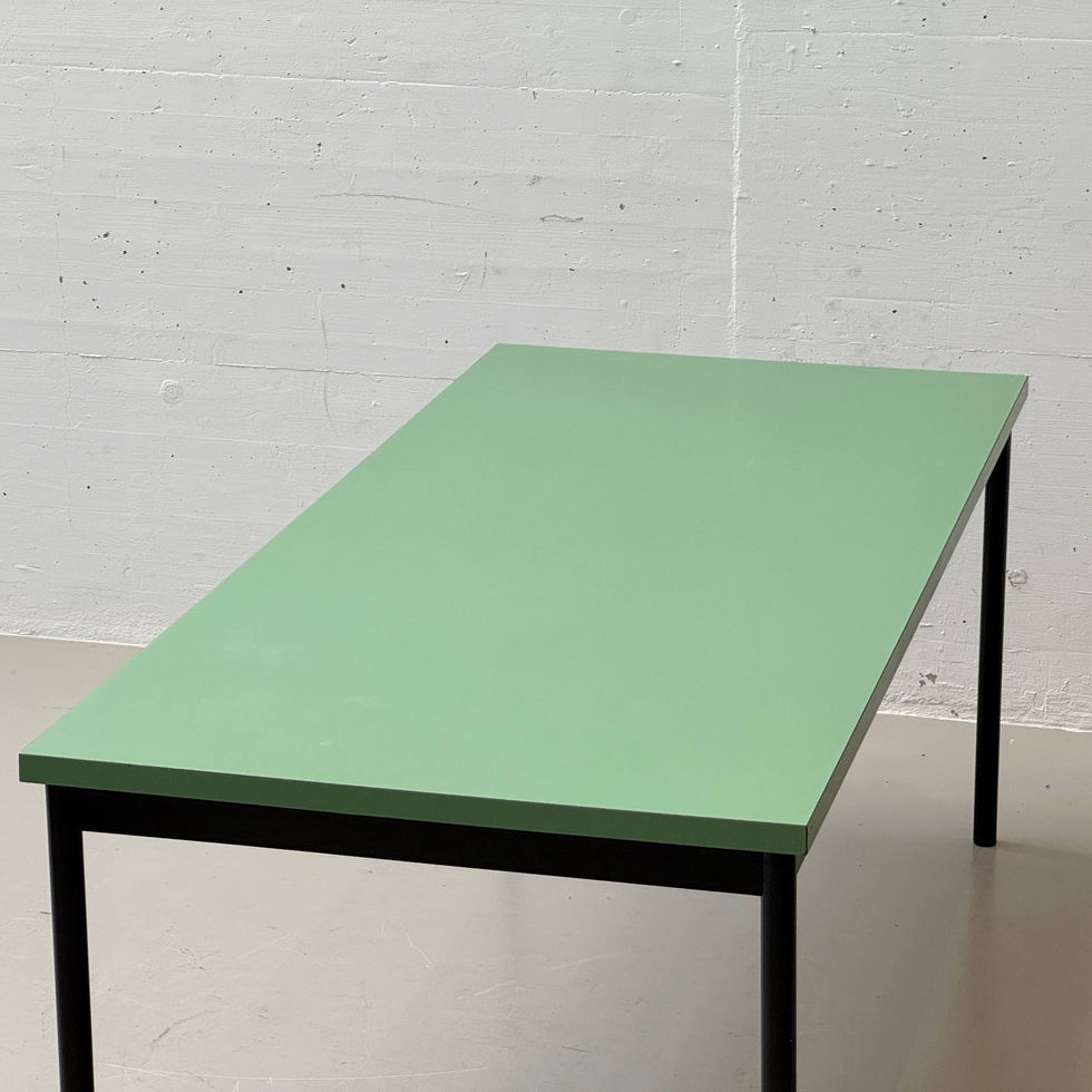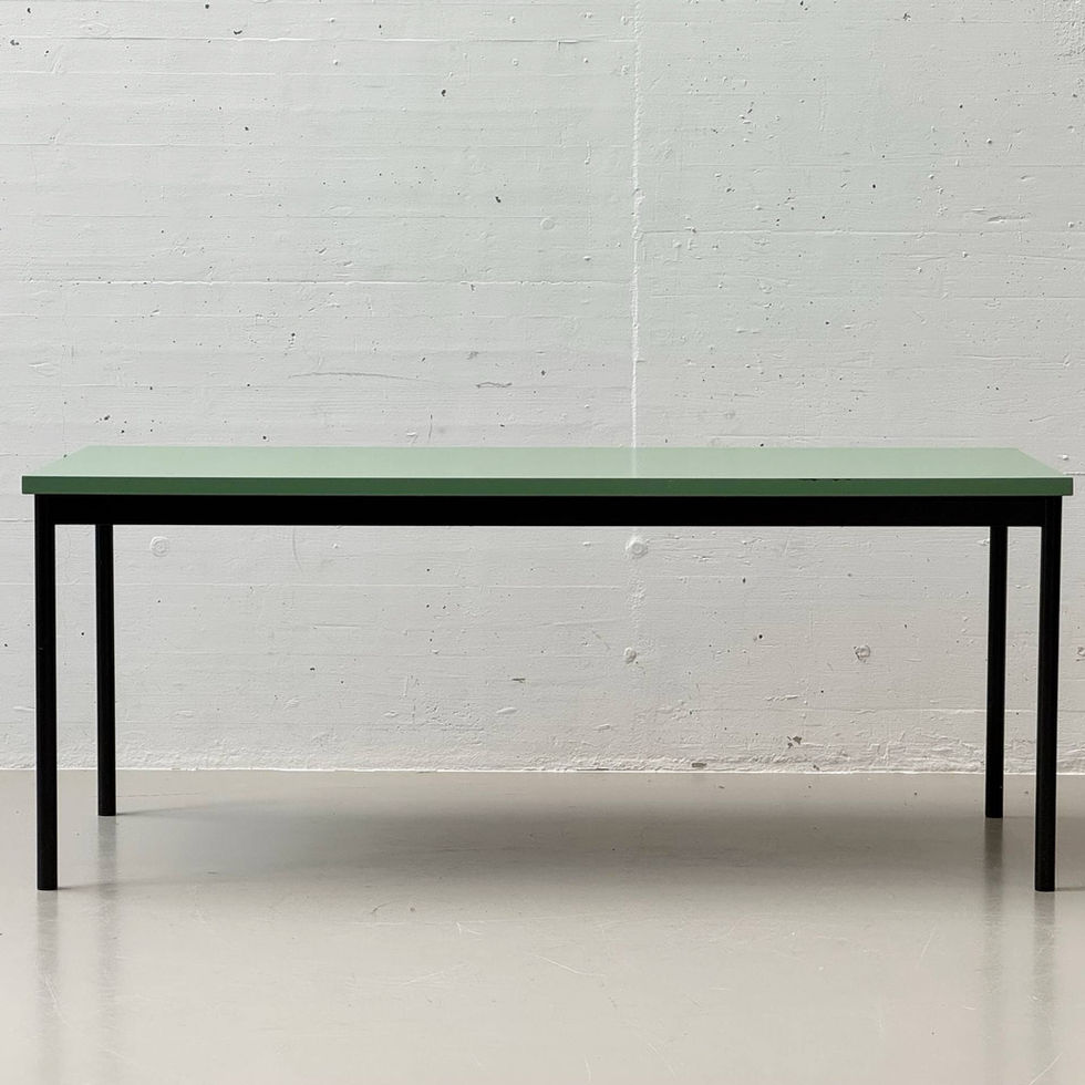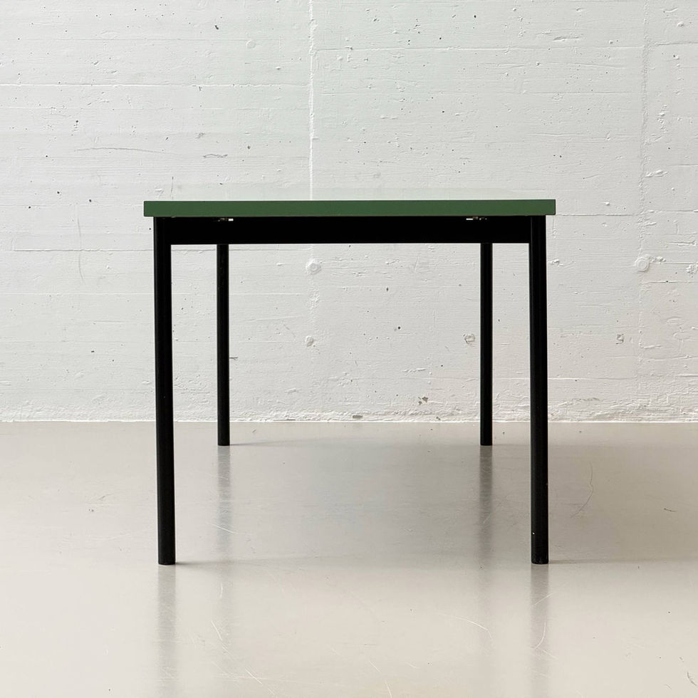 Schlichter, funktional gehaltener Esstisch aus der Schweizer Produktion Stein am Rhein. Die zurückhaltende Gestaltung kombiniert eine matt grün beschichtete Tischplatte mit einem schwarz lackierten Metallgestell. Die klare Linienführung und die schlanken, zylindrischen Beine verleihen dem Tisch eine sachliche, beinahe industrielle Anmutung, wie sie für funktionale Entwürfe der 1980er- und 1990er-Jahre typisch ist. Die rechteckige Platte ist mit einer robusten Kunstharz- beziehungsweise Schichtstoffoberfläche versehen, welche pflegeleicht und alltagstauglich ist. Die leicht überstehende Kante betont die klare Geometrie, während das verschraubte Stahlgestell mit umlaufender Zarge für Stabilität sorgt. Unterseitig befindet sich das Herstellerlabel Stein am Rhein, was die Schweizer Herkunft dokumentiert.