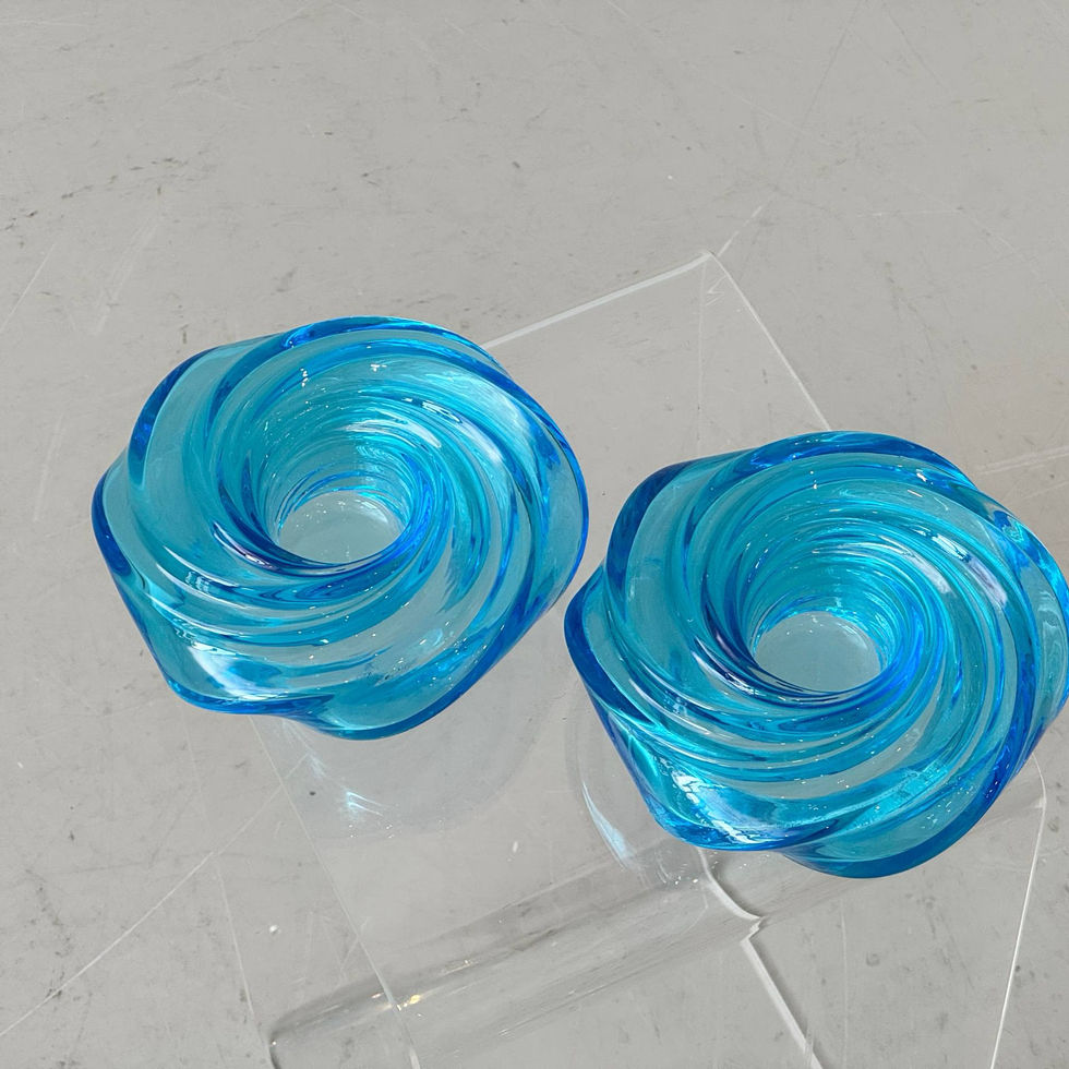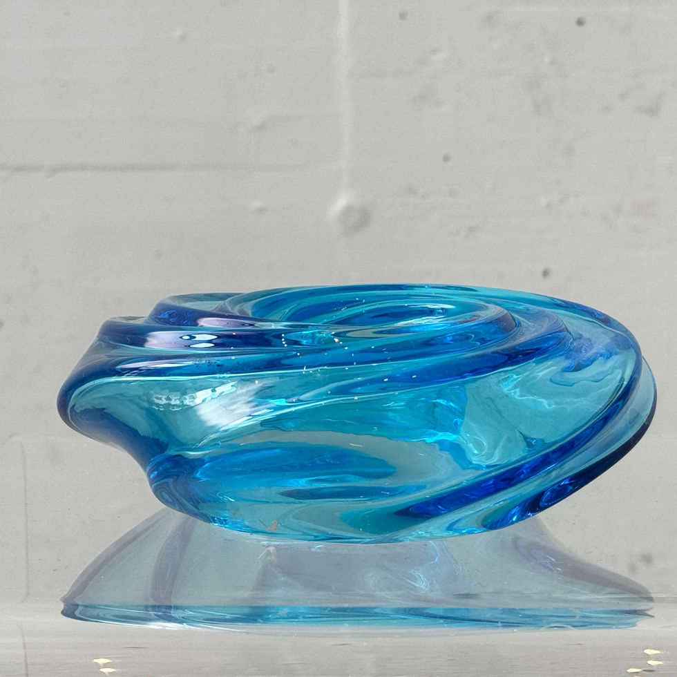 Aussergewöhnliche Teelichthalter aus massivem Muranoglas, entstanden 2014 in einer Zusammenarbeit zwischen dem renommierten Glashersteller Vistosi, dem Schweizer Atelier Schlaepfer und im Auftrag von Nestlé. Diese seltene Kollaboration verbindet traditionelle venezianische Glaskunst mit einer modernen, skulpturalen Formensprache. Die organisch gedrehte, spiralförmige Struktur wirkt wie ein eingefrorener Strudel aus Glas. Durch das Zusammenspiel von klarem und intensiv türkisfarbenem Glas entstehen faszinierende Tiefenwirkungen, die je nach Lichteinfall lebendig changieren. Die zentrale Öffnung ist perfekt für ein Teelicht integriert und verstärkt durch Reflexionen die plastische Wirkung des Objekts. Die schwere, massive Ausführung unterstreicht die hohe handwerkliche Qualität der Murano-Fertigung. Jedes Stück ist ein Unikat mit individuellen Glasverläufen und feinen Einschlüssen – typische Merkmale echter Handarbeit.