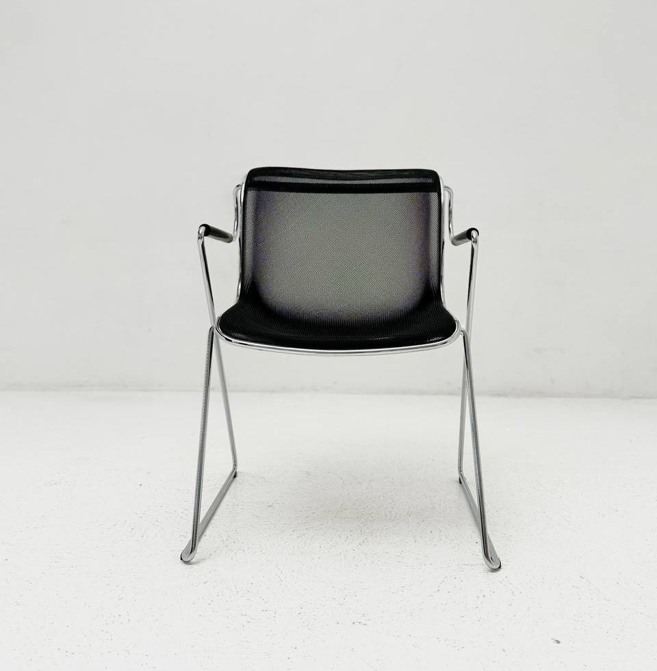 Dieser ikonische Stuhl wurde 1982 von Charles Pollock entworfen und von Anonima Castelli in Italien hergestellt. Der Penelope-Stuhl vereint Design und Funktionalität auf elegante Weise und besticht durch die Kombination eines verchromten Stahlgestells mit einer Sitzschale aus schwarzem Drahtgeflecht. Sein schlankes und zeitloses Design macht ihn sowohl für Wohnräume als auch für Büros zur idealen Wahl.