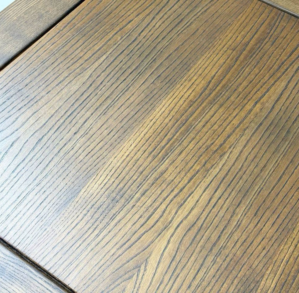 Couchtisch aus massivem Eichenholz in warmem Mittelbraun, mit umlaufendem Rahmenprofil und mittig eingelassener Tischplatte. Die abgeschrägten Eckverbindungen sowie die charakteristische Maserung verleihen dem Tisch eine hochwertige und solide Ausstrahlung, typisch für Wohnmöbel der späten 1970er Jahre. Die kantige, klare Formensprache in Kombination mit dem satten Holzton erinnert an skandinavische Wohnkonzepte dieser Zeit. Vier gerade Beine tragen den Tisch sicher und stabil und machen ihn zu einem funktionalen Möbelstück für Wohn- oder Loungebereiche.