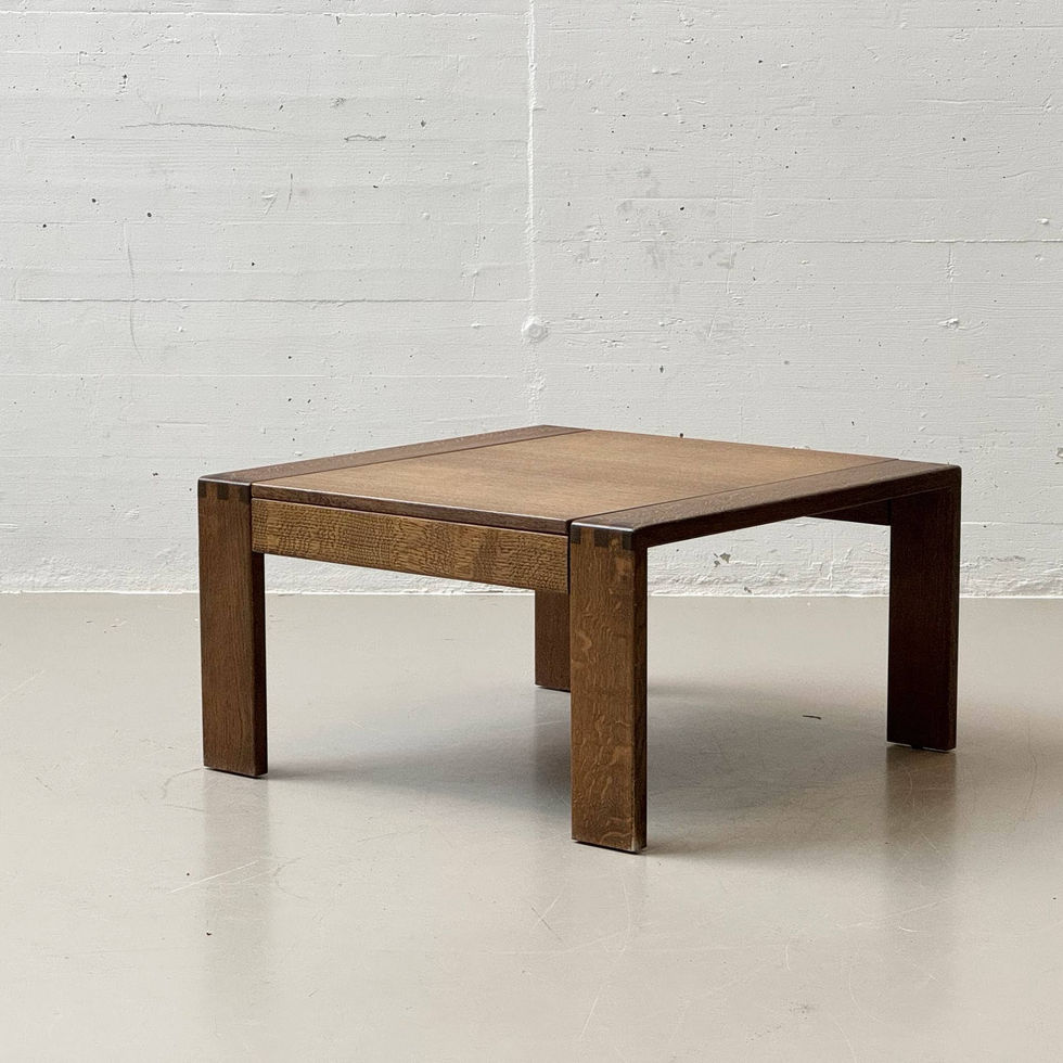 Quadratischer Couchtisch aus massivem Holz mit klarer, konstruktiver Formensprache, ausgeführt in dunkel gebeizter Oberfläche mit markanter, gleichmässiger Maserung. Die Tischplatte ist in ein umlaufendes Rahmenelement eingelassen und bildet zusammen mit den rechtwinklig ausgeführten Beinen eine ruhige, ausgewogene Gesamtwirkung. Charakteristisch sind die sichtbar ausgearbeiteten Eckverbindungen, welche den handwerklichen Anspruch und die solide Bauweise betonen. Das reduzierte Design und die stabile Konstruktion verweisen auf eine sachliche Mid-Century-Ästhetik mit zeitloser Wirkung.