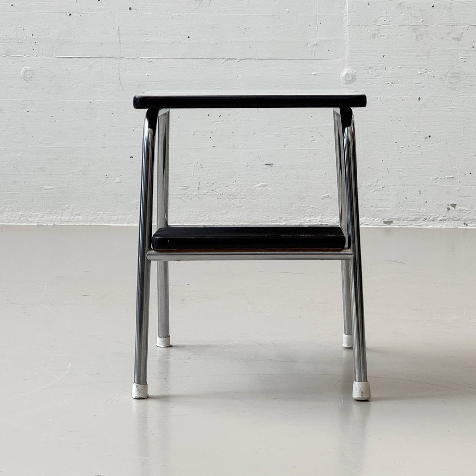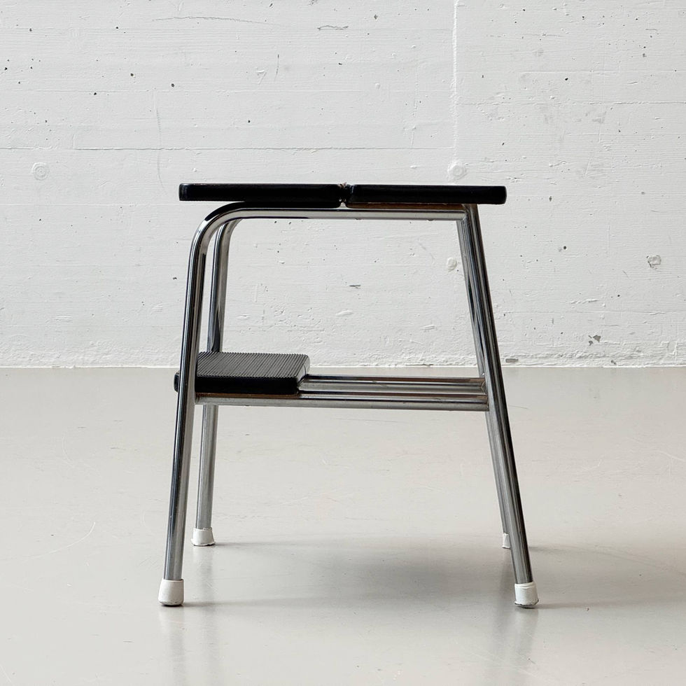Funktionaler und zugleich charakterstarker Tritthocker aus Schweizer Produktion von Kelko, gefertigt in den 1960er bis 1970er Jahren. Typisch für diese Zeit verbindet das Objekt eine klare, industrielle Formensprache mit hoher Alltagstauglichkeit. Das Gestell besteht aus verchromtem Stahlrohr und wirkt durch die schlanke Konstruktion leicht und stabil zugleich. Die Trittflächen sind mit geriffeltem Kunststoff bzw. Resopal belegt, was für sicheren Stand sorgt und gleichzeitig die robuste Nutzung im Haushalt unterstreicht. Besonders charakteristisch ist die klappbare Mechanik: Im geschlossenen Zustand kompakt und platzsparend, lässt sich der Hocker mit wenigen Handgriffen zu einer stabilen zweistufigen Trittleiter ausklappen. Ein klassischer Alltagshelfer, wie er in Küchen, Werkstätten und Haushalten der Nachkriegszeit weit verbreitet war.