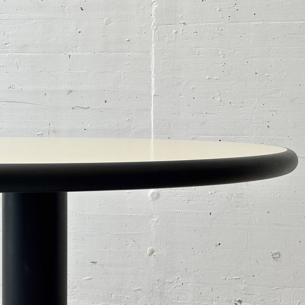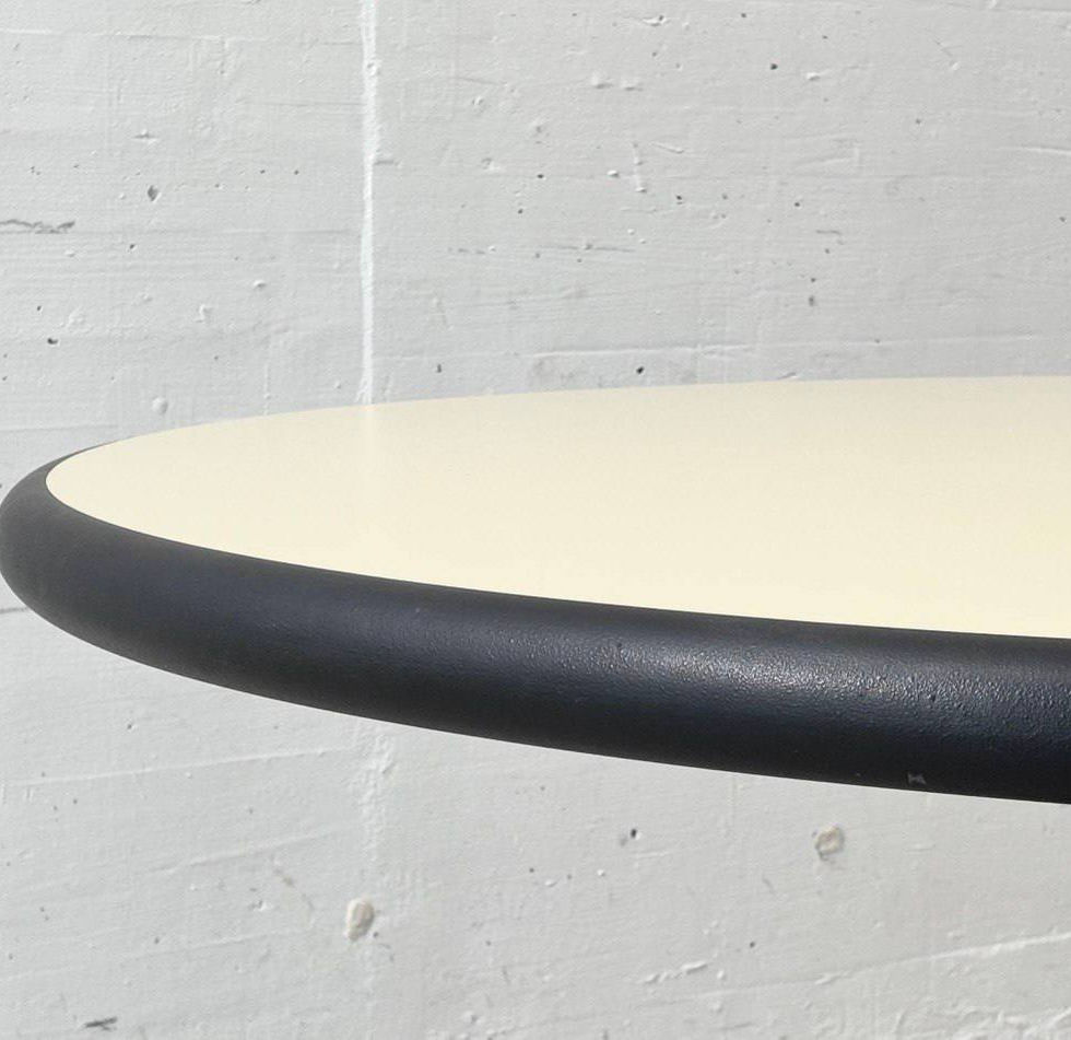 Klar in der Form, funktional im Ausdruck und mit einer zeitlosen Zurückhaltung gestaltet – dieser runde Tisch wurde von Gerd Lange für Thonet entworfen und steht exemplarisch für die sachliche Designhaltung der späten Moderne. Die grosszügige Tischplatte mit Resopal-Beschichtung und einem Durchmesser von 128 cm bietet viel Raum und wirkt durch die helle Oberfläche in Kombination mit der schwarzen Kante besonders elegant und ausgewogen. Getragen wird die Platte von einem zentralen Säulenfuss aus schwarz beschichtetem Metall, der in einen markanten Tellerfuss übergeht. Besonders charakteristisch ist die strukturierte Oberfläche am Fuss: feine, noppenartige Erhebungen verleihen dem Tisch nicht nur eine grafische Tiefe, sondern bieten zugleich ein überraschendes, haptisches Detail – fast wie eine dezente Fussmassage beim Berühren. Ein funktionales wie spielerisches Element, das den Entwurf subtil aufwertet.