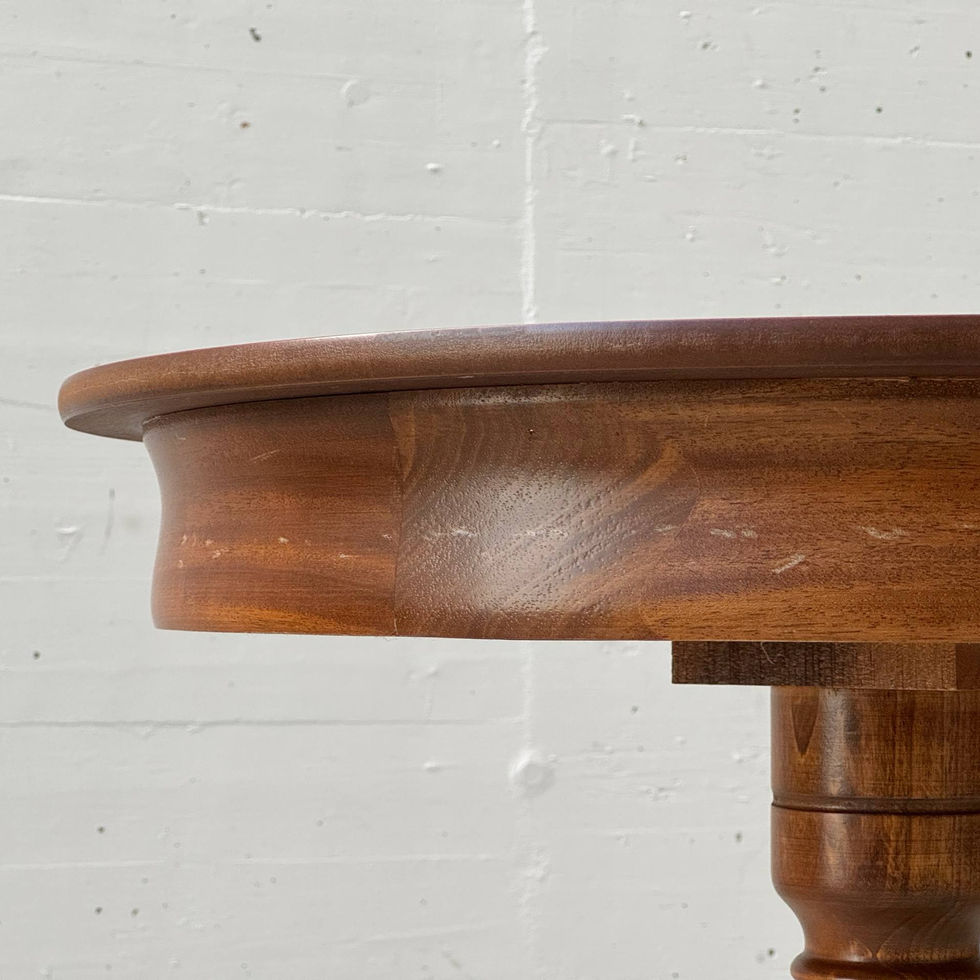 Eleganter runder Beistelltisch mit klassisch geprägter Formensprache und handwerklich ausgearbeitetem Dreifussgestell. Die runde Tischplatte ist furniert und zeigt eine lebendige, warme Maserung, die auf Kirschholzfurnier hinweist. Der leicht überstehende Plattenrand sowie die umlaufende Zarge verleihen dem Tisch eine harmonische, ausgewogene Proportion. In die Zarge integriert ist eine kleine Schublade mit dekorativem Metallknauf, die dezenten Stauraum für kleinere Gegenstände bietet. Getragen wird die Platte von einem gedrechselten Mittelfuss, der in drei elegant geschwungene Füsse übergeht. Diese klassische Dreifusskonstruktion sorgt für eine stabile Standfestigkeit und verleiht dem Möbel gleichzeitig eine leichte, fast skulpturale Wirkung. Die warm gebeizte Oberfläche unterstreicht den traditionellen Charakter des Tisches und bringt die natürliche Maserung des Holzes besonders schön zur Geltung. Die Gestaltung bewegt sich stilistisch zwischen spätem Biedermeier-Revival und klassisch inspirierten Wohnmöbeln der Mitte des 20. Jahrhunderts.