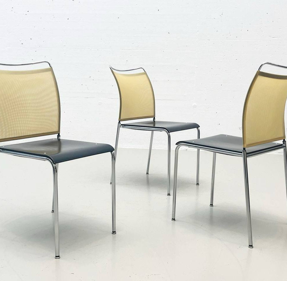 Besonders prägnant ist die Rückenlehne aus einem flexiblen, transluzenten Netzgewebe, das nicht nur optisch für Leichtigkeit sorgt, sondern auch ergonomisch angepasst ist und einen hohen Sitzkomfort bietet. Am oberen Abschluss befindet sich eine durchgehende, verchromte Griffstange, die das Handling beim Stapeln erleichtert und gleichzeitig als gestalterisches Detail wirkt.
